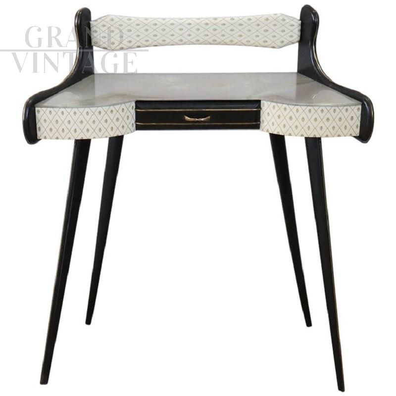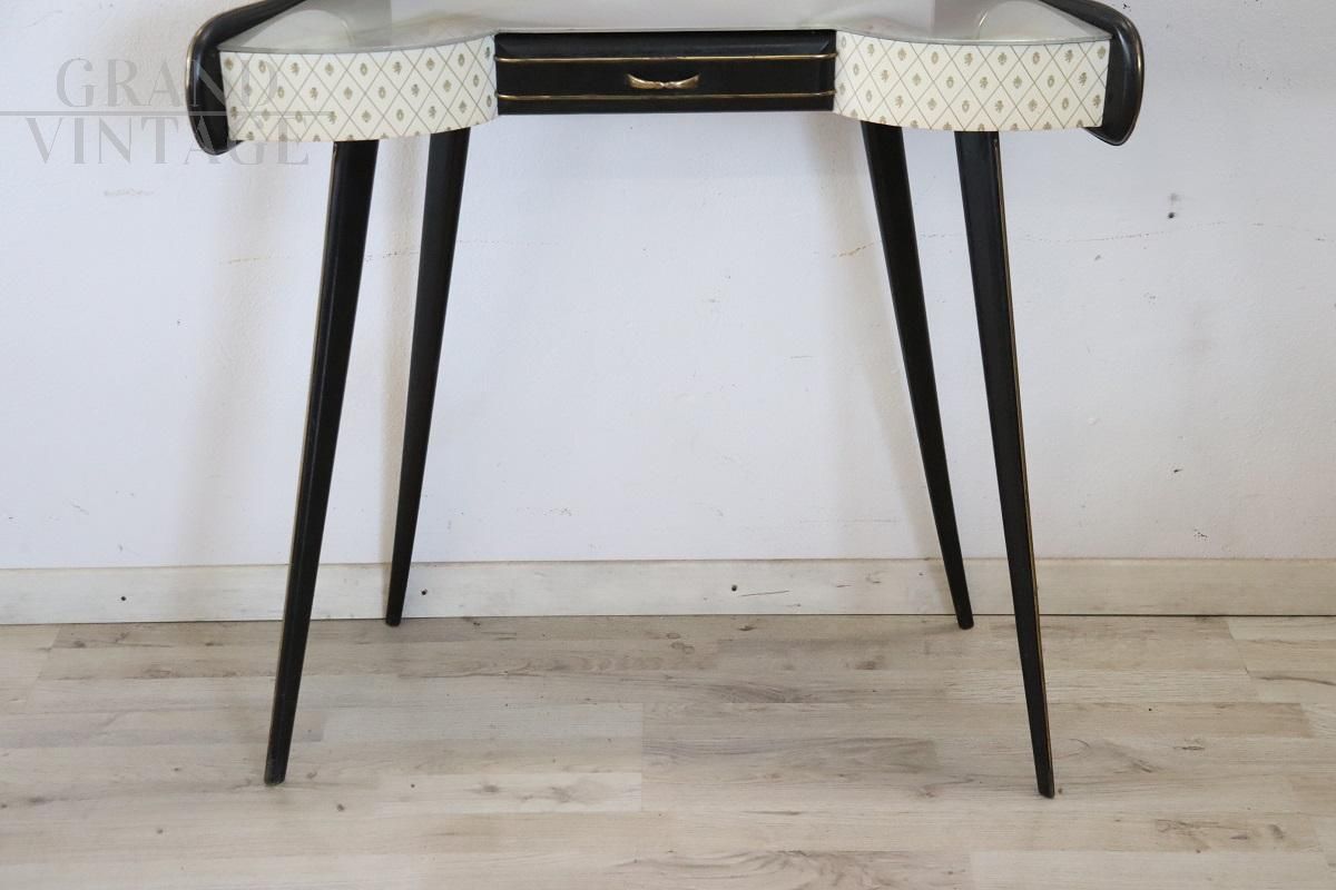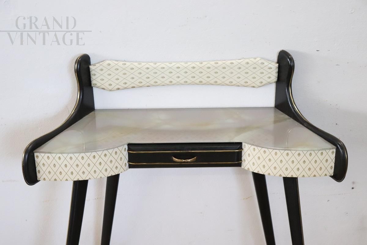 Particolare consolle vintage degli anni '50 realizzata in legno laccato nero con una bella linea mossa sul fronte e dotata di un pratico cassetto. Il piano è in vetro decorato effetto marmo, il fronte è rivestito in plastica con decorazione stampata. Deliziose decorazioni in ottone dorato mettono in risalto le parti laccate nere. Perfetta per un ambiente moderno, si consiglia, ma non strettamente necessario, il fissaggio a parete per una maggiore stabilità. Piccoli naturali segni di usura, ottimo prezzo trattabile.