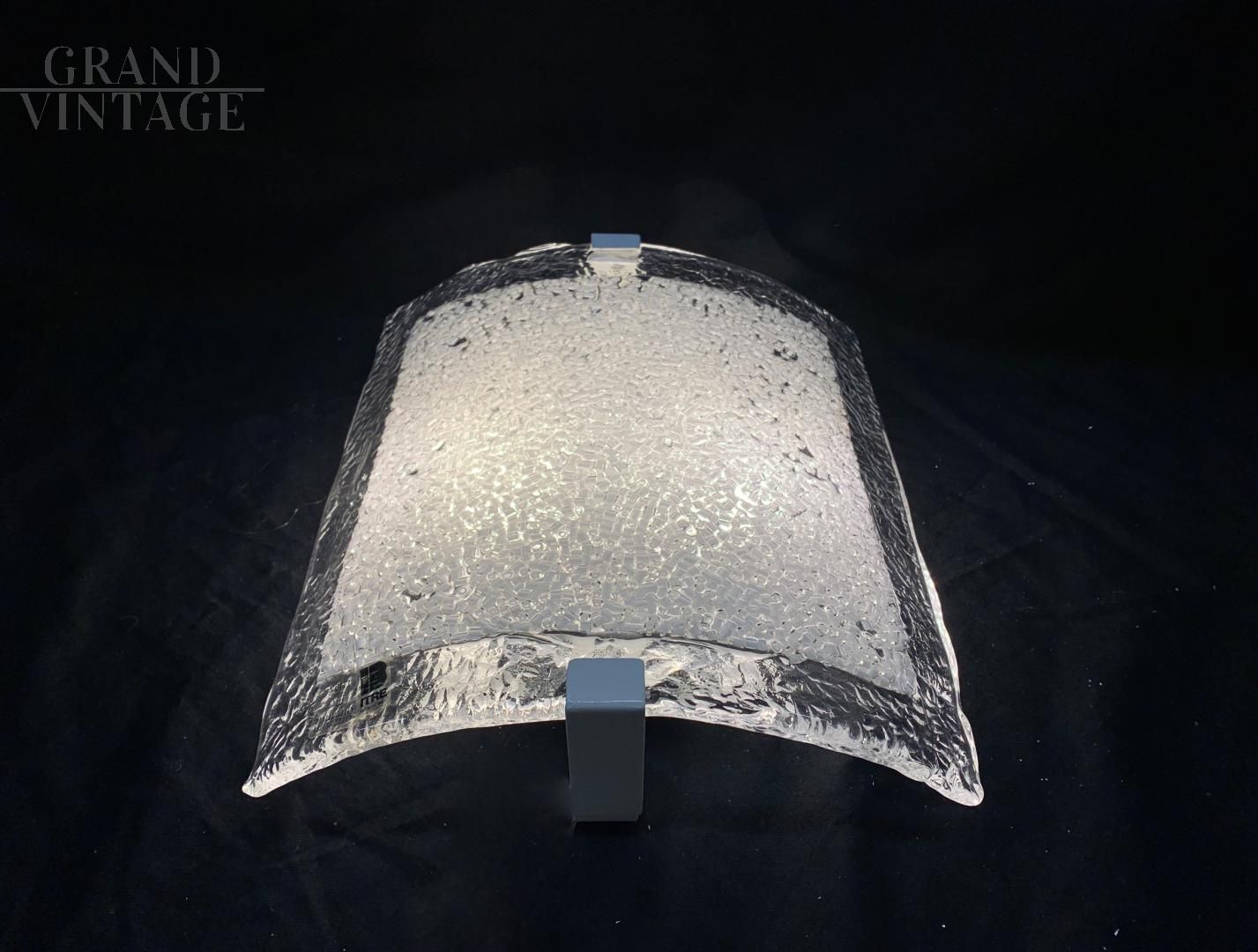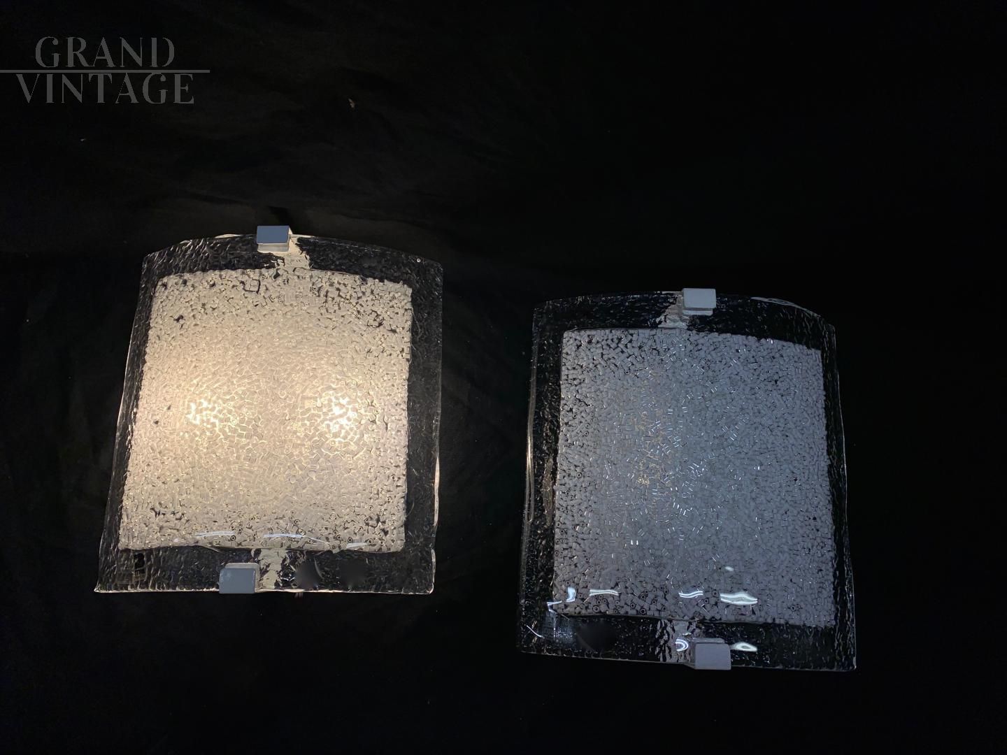 Coppia di applique in vetro di Murano della ditta i3, anni '70, vetri trasparenti con lavorazione su piastra con all'interno delle murrine bianche latte. Hanno il bollino i3 a garanzia dell'originalità. Vetri perfetti, impianto elettrico rifatto, ciascuna delle applique ha una presa per lampadina E27.