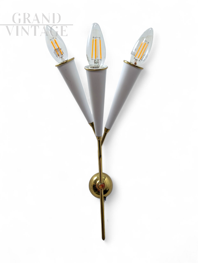 Applique lampade da parete vintage in ottone dorato con 3 punti luce a cono laccati bianchi, modernariato anni '60. Ottime condizioni, l'ottone è stato lucidato ma presenta alcuni segni del tempo, come da foto. Attacchi per lampadine di tipo E14 (lampadine non incluse).