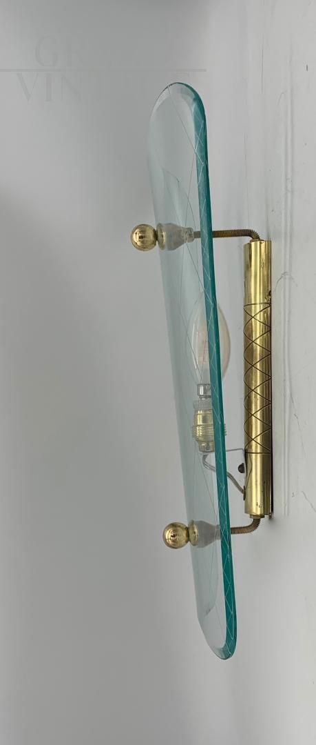 Coppia di appliques degli anni '50 circa attribuibili a FontanaArte con vetri lavorati vetri molto belli e leggeri con struttura in ottone. E' tutto originale, hanno solo qualche segno del tempo sulla montatura in ottone. Vetro fantastico non crepato, impianto elettrico nuovo e funzionante. Da notare la bellezza del vetro soffiato su stampo con molatura interna. Ottimi elementi, perfetti per illuminare diverse stanze: dalla cucina alla sala, dall'entrata al bagno. Ciascuna applique ha un un attacco per lampadina di tipo E14, si consiglia l'utilizzo di lampadine la Led.