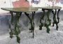 Bellissima coppia di consolle, a demi-lune in legno laccato nei toni del verde vagone piede a fratino.