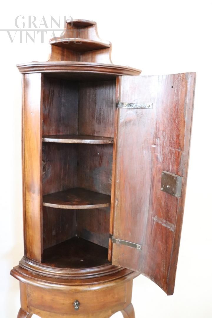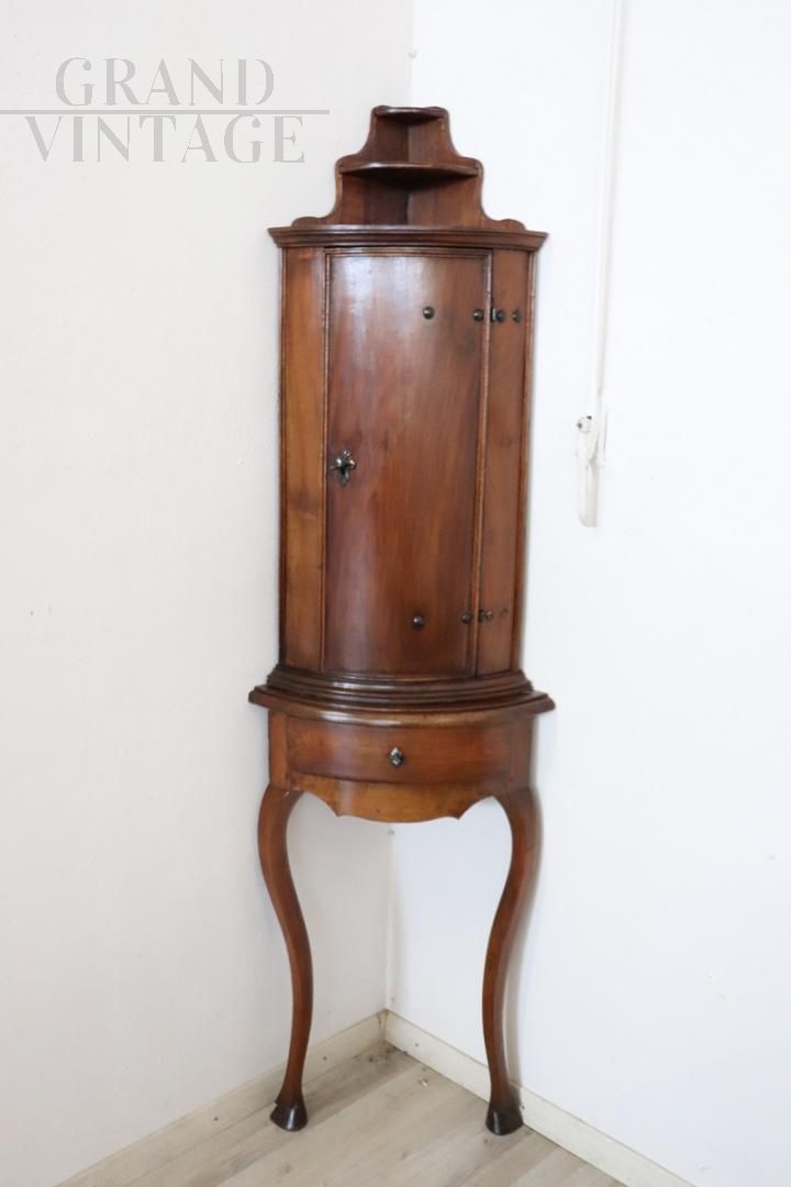 Coppia di angoliere italiane antiche del periodo Luigi XV, risalenti alla metà del XVIII secolo, perfette per conferire un fascino storico unico al vostro spazio abitativo. Realizzate in noce massello, queste angoliere sono perfette per migliorare l'estetica di qualsiasi spazio, offrendo al contempo funzionalità. Ciascuna angoliera è composta da due corpi sovrapposti: una base con eleganti gambe sottili e ricurve e una parte superiore con un'anta. Questo design modulare rende facile lo spostamento e l'adattamento a diversi ambienti. La sezione superiore ha una forma arrotondata che ne accresce il fascino. Il vano superiore comprende due ripiani, mentre la sezione inferiore offre un piccolo cassetto. Ogni lato angolare misura 40 cm. Prezzo trattabile.