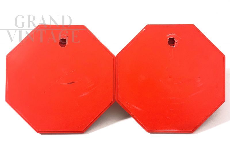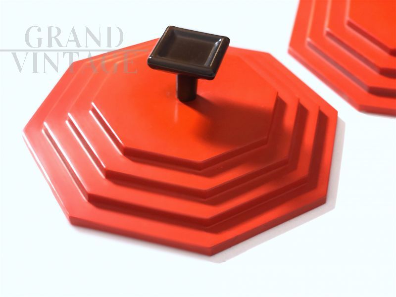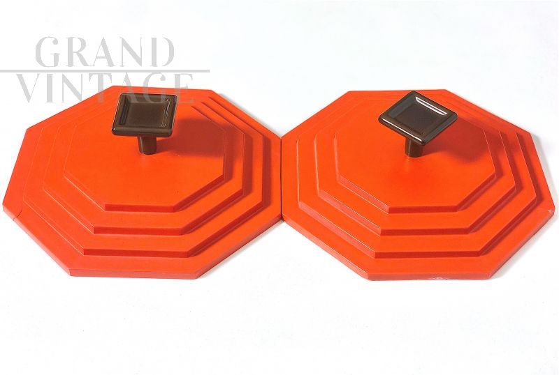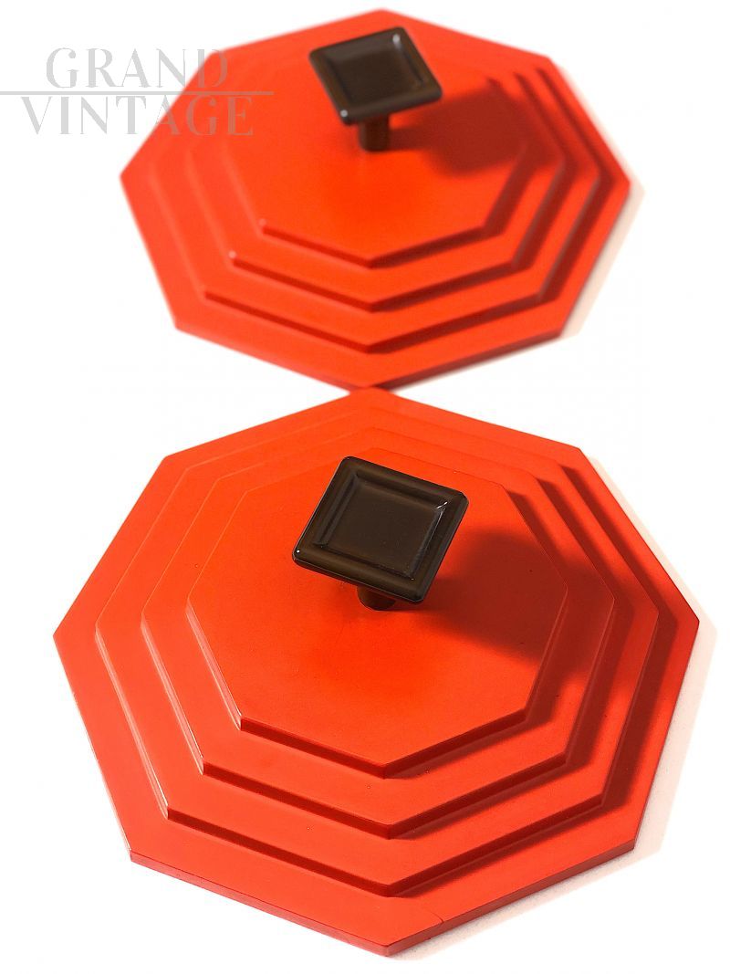 Splendido set di appendiabiti vintage colo arancione degli anni 70, dal design geometrico e futuristico ispirato allo style Spage Age. Di forma ottagonale a più livelli con un effetto tridimensionale, accentuato dal contrasto tra i colori e il pomello squadrato. Questi appendiabiti rappresentano un'icona del design pop anni '70, realizzati in plastica ABS rigida, perfetti per aggiungere un tocco retrò e originale. In condizioni perfette.