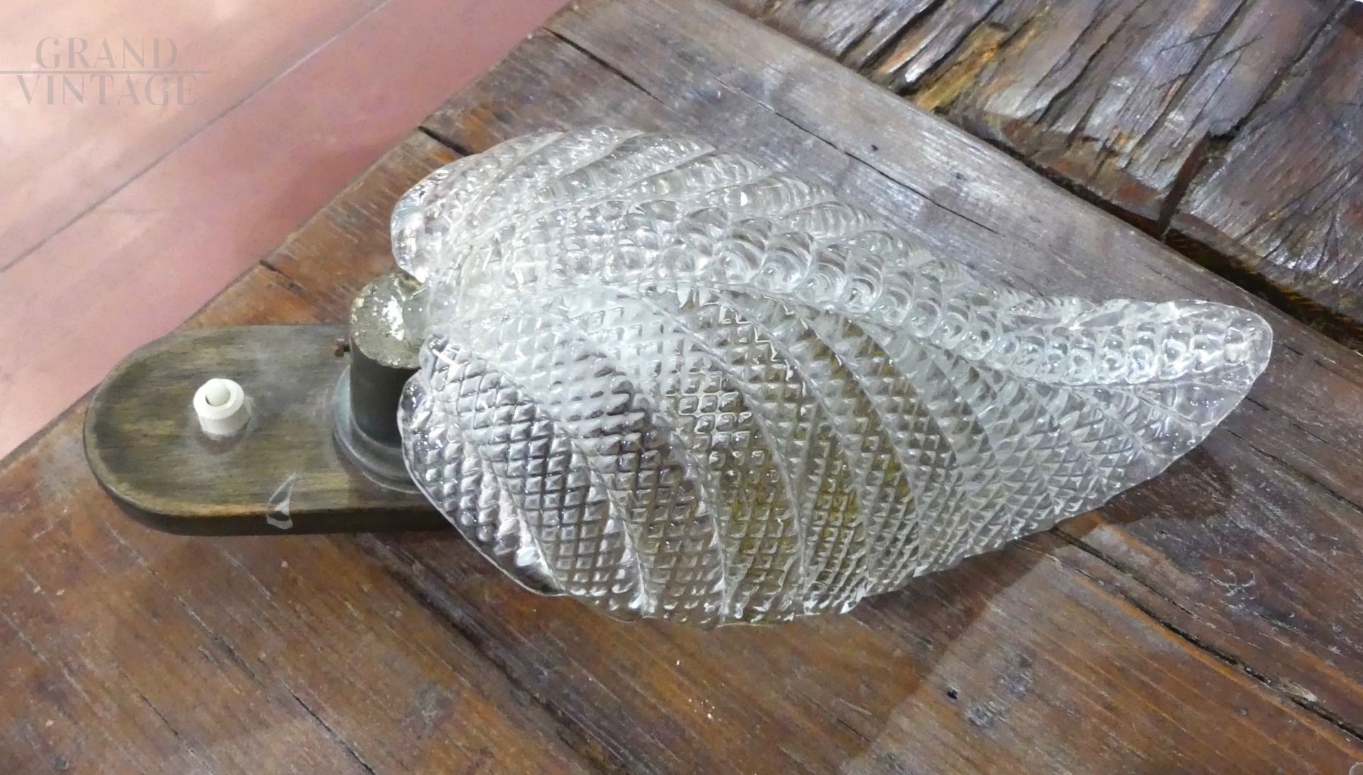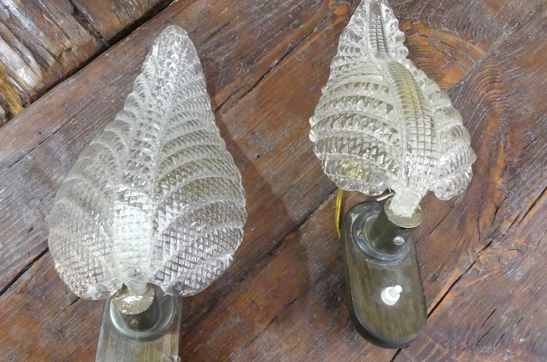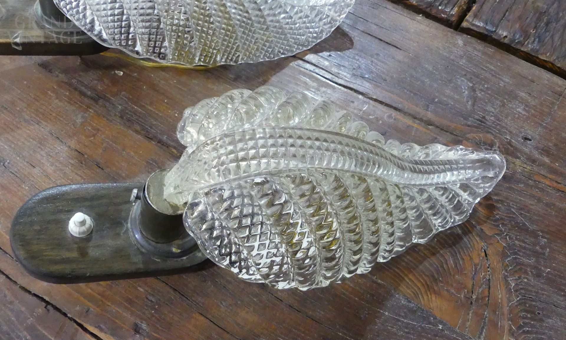 Bellissima e rara coppia di applique a foglia in vetro di Murano anni '30 attribuibili a Barovier. I vetri sono lavorati totalmente a mano, senza stampo, e sono di due forme diverse come si usava all'epoca, una applique femminile e una maschile. La struttura da fissare al muro è in legno dipinto in colore ottonato e ha un tastino per accensione e spegnimento, funzionante. Tra il vetro e la struttura in legno ci sono dettagli in ottone, con i naturali segni del tempo. Le lampade sono quasi certamente della ditta Barovier, non presentano il bollino perhè questo fu introdotto solo negli anni '60.