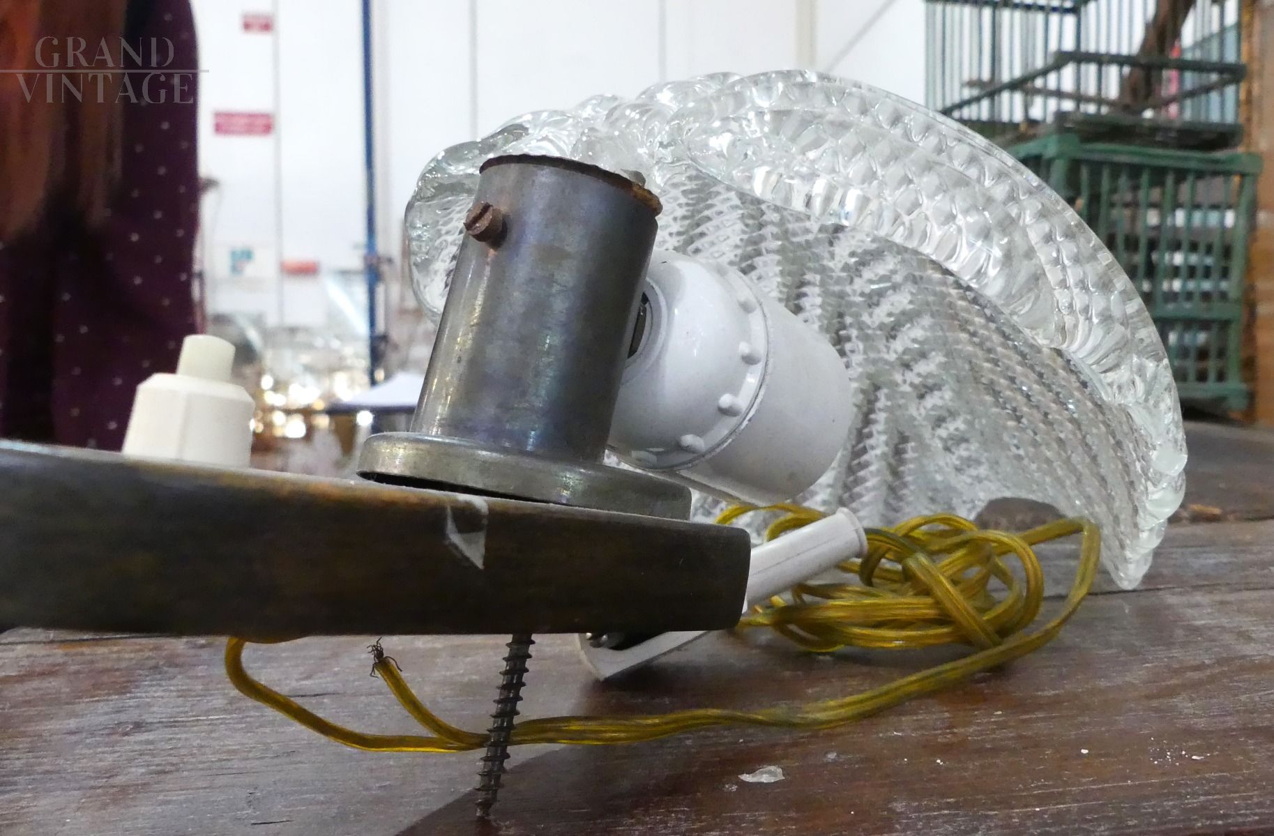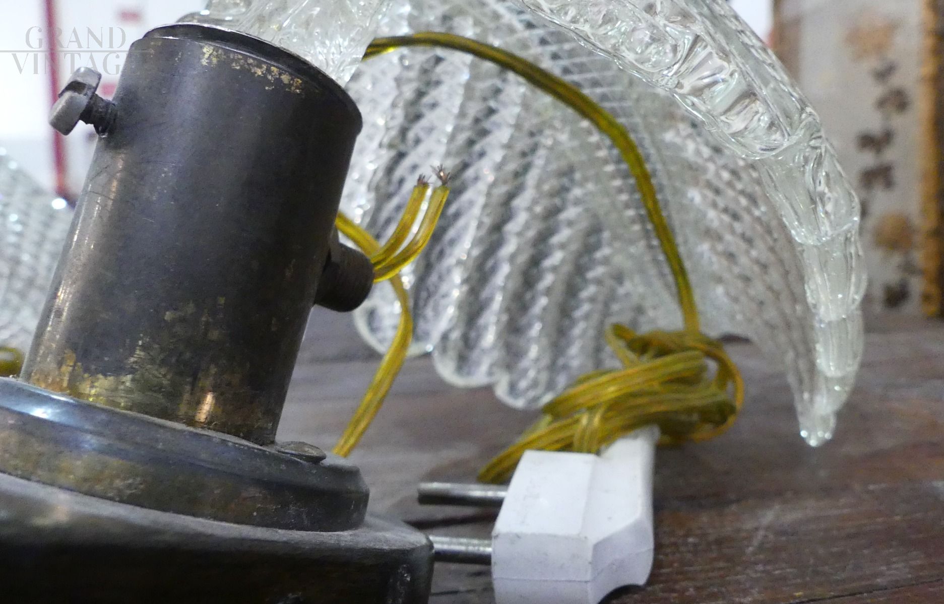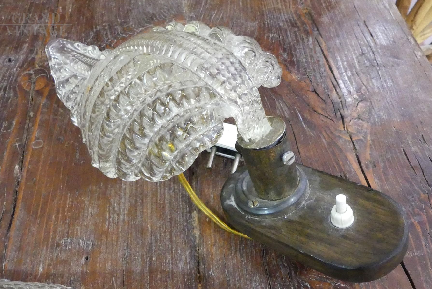 Bellissima e rara coppia di applique a foglia in vetro di Murano anni '30 attribuibili a Barovier. I vetri sono lavorati totalmente a mano, senza stampo, e sono di due forme diverse come si usava all'epoca, una applique femminile e una maschile. La struttura da fissare al muro è in legno dipinto in colore ottonato e ha un tastino per accensione e spegnimento, funzionante. Tra il vetro e la struttura in legno ci sono dettagli in ottone, con i naturali segni del tempo. Le lampade sono quasi certamente della ditta Barovier, non presentano il bollino perhè questo fu introdotto solo negli anni '60.