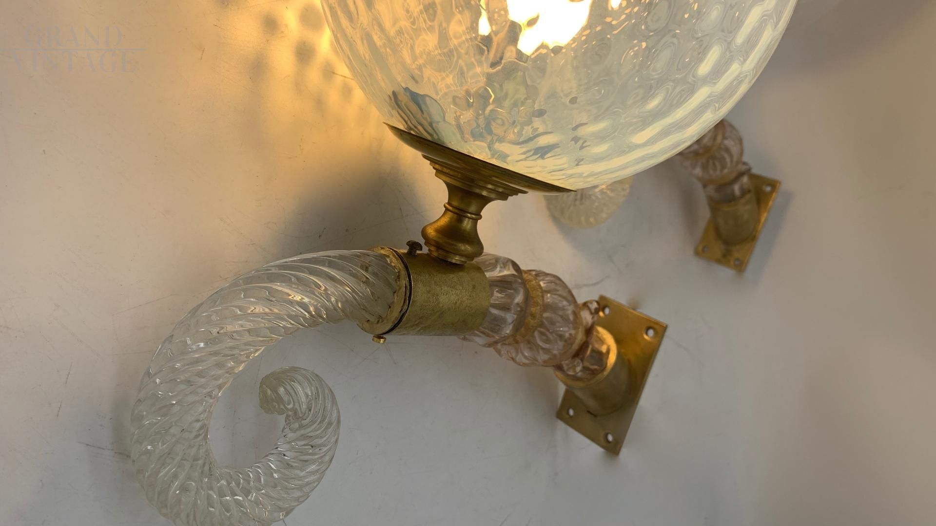 Coppia di applique lampade da parete in stile classico con struttura in ottone e braccio decorativo in vetro soffiato trasparente lavorato a righe a forma di ricciolo le sfere in vetro trasparente presentano una superficie martellata a rilievo che crea effetti di luce e ombra l’applique accesa diffonde una luce calda mentre quella a destra è spenta valorizzando la trasparenza e la lavorazione del vetro. Le basi di fissaggio a parete sono in ottone con forma rettangolare semplice e funzionale da cui si sviluppa il braccio curvato e riccamente lavorato che sorregge la sfera in vetro soffiato