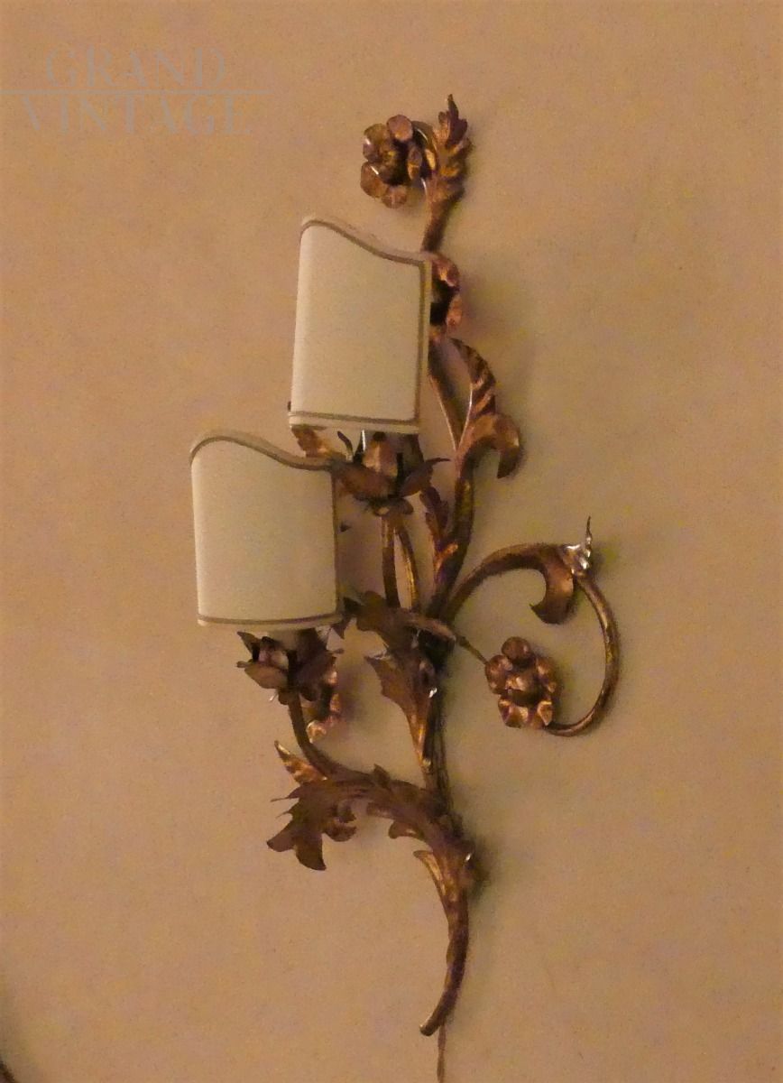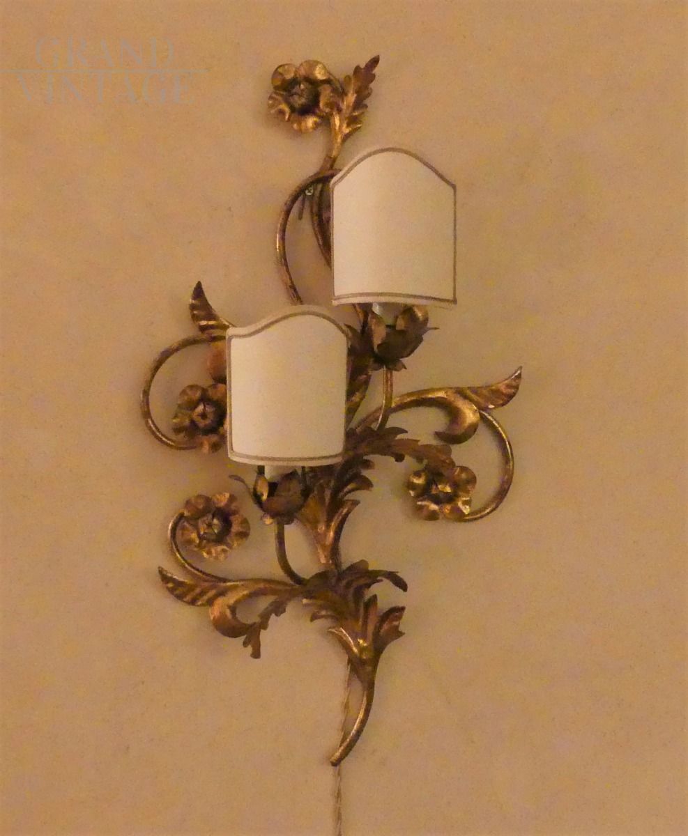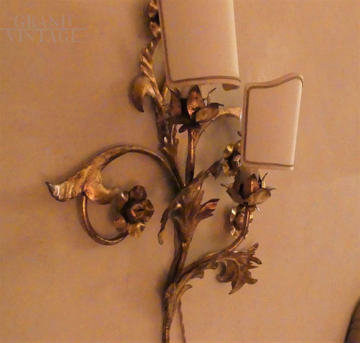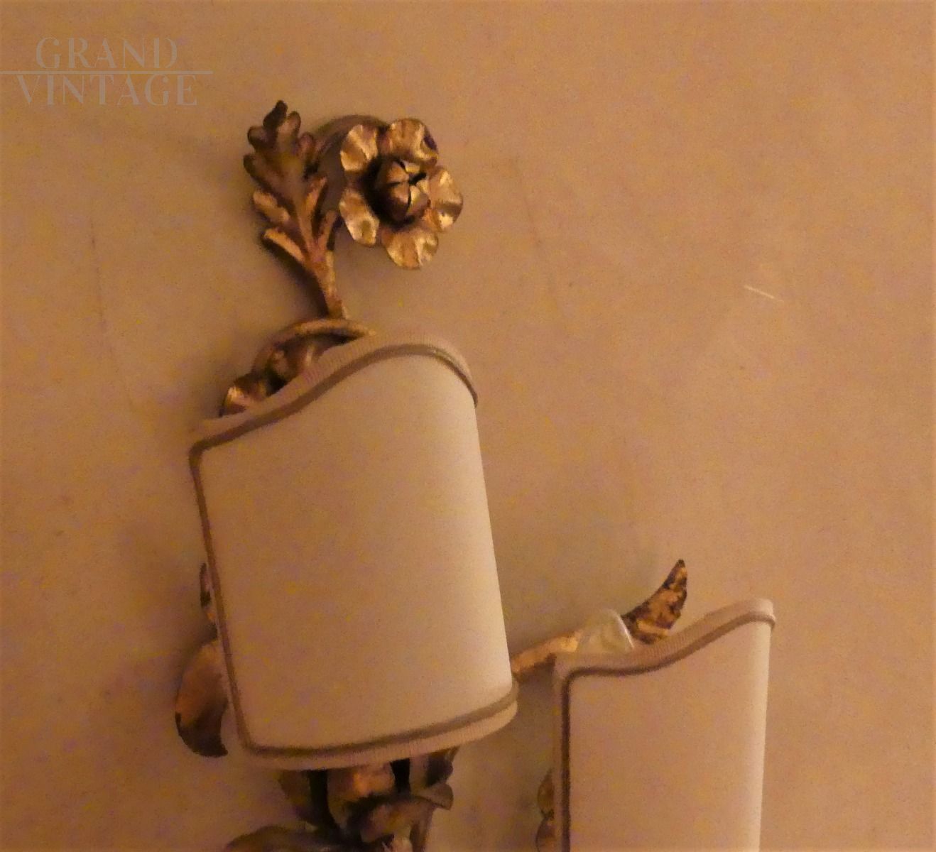 Meravigliosa coppia di applique antiche degli inizi dell'800 in bronzo dorato, con un bellissimo stelo a motivo florale a sorreggere due lampadine ciascuno, con portalampadina a forma di candela. Le lampadine sono coperte da paralume in stoffa bianca con profili dorati.