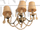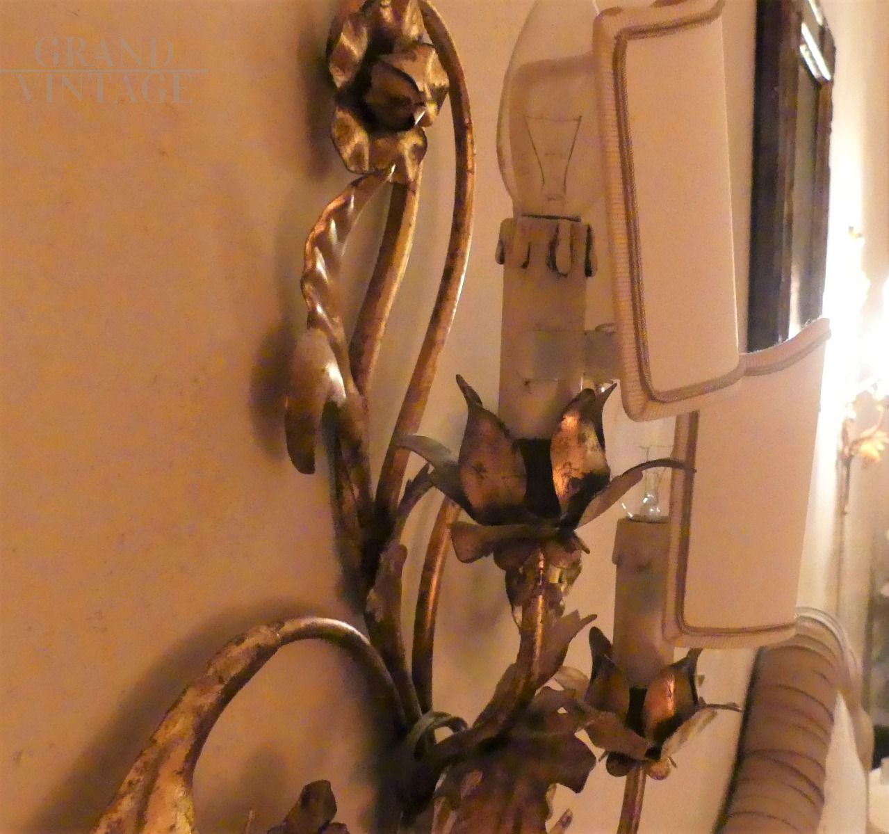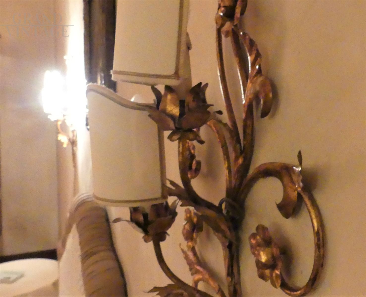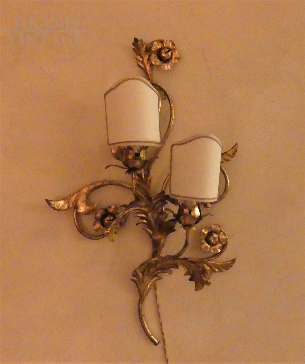 Meravigliosa coppia di applique antiche degli inizi dell'800 in bronzo dorato, con un bellissimo stelo a motivo florale a sorreggere due lampadine ciascuno, con portalampadina a forma di candela. Le lampadine sono coperte da paralume in stoffa bianca con profili dorati.