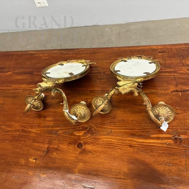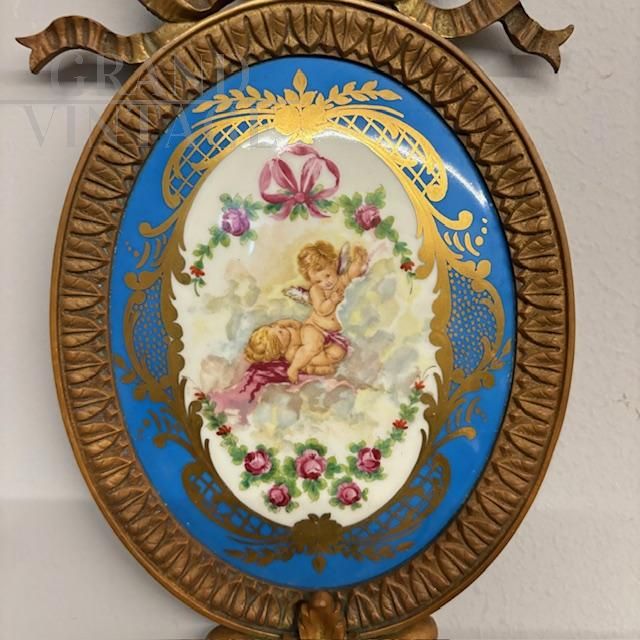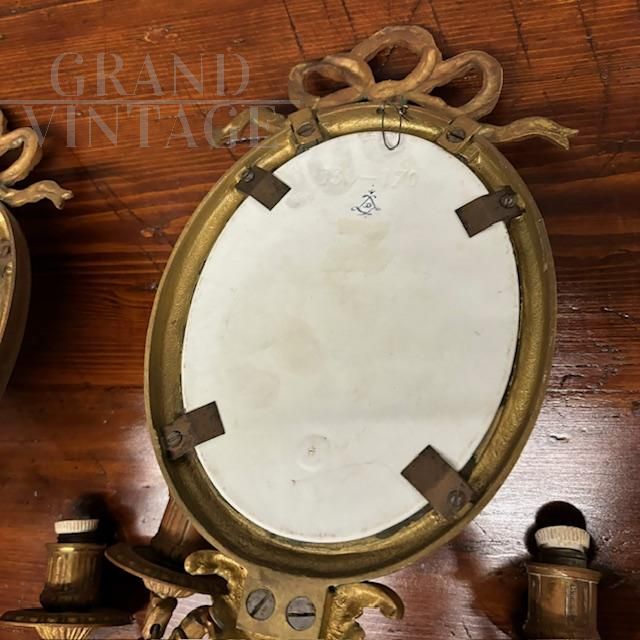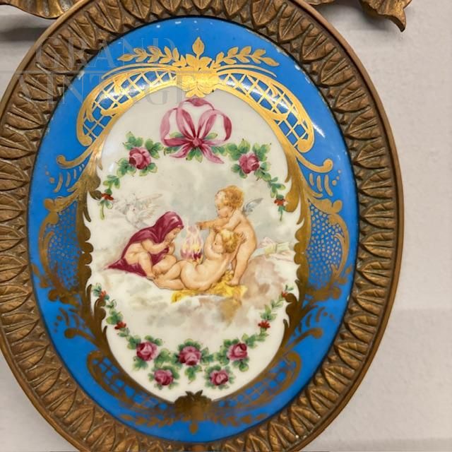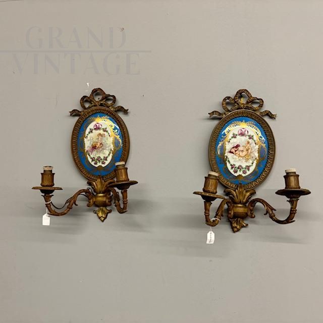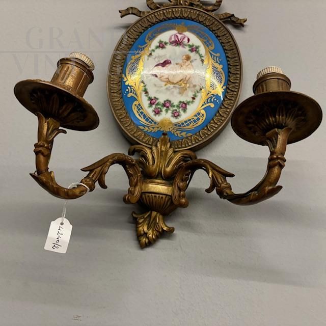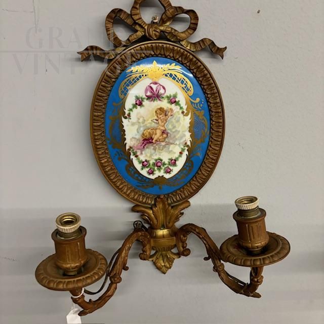 Coppia di applique antiche in bronzo e ceramica Limoges dipinta