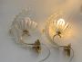 Coppia di applique da parete in vetro e ottone dallo stile elegante e decorativo. Le applique sono realizzate principalmente in vetro trasparente lavorato con dettagli dorati in ottone. La struttura ha una forma sinuosa e curva, con un braccio che sostiene un coppa a forma di fiore. Il vetro è lavorato con una texture ondulata che crea un effetto decorativo. Queste applique ricordano il design classico veneziano, con un forte richiamo all'artigianato artistico del vetro. Il vetro trasparente si combina con dettagli dorati, creando un look raffinato e lussuoso. Ogni applique ha un portalampada e 14.