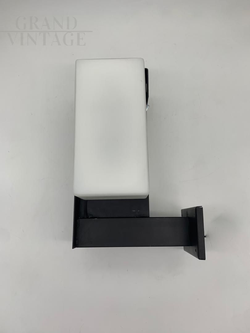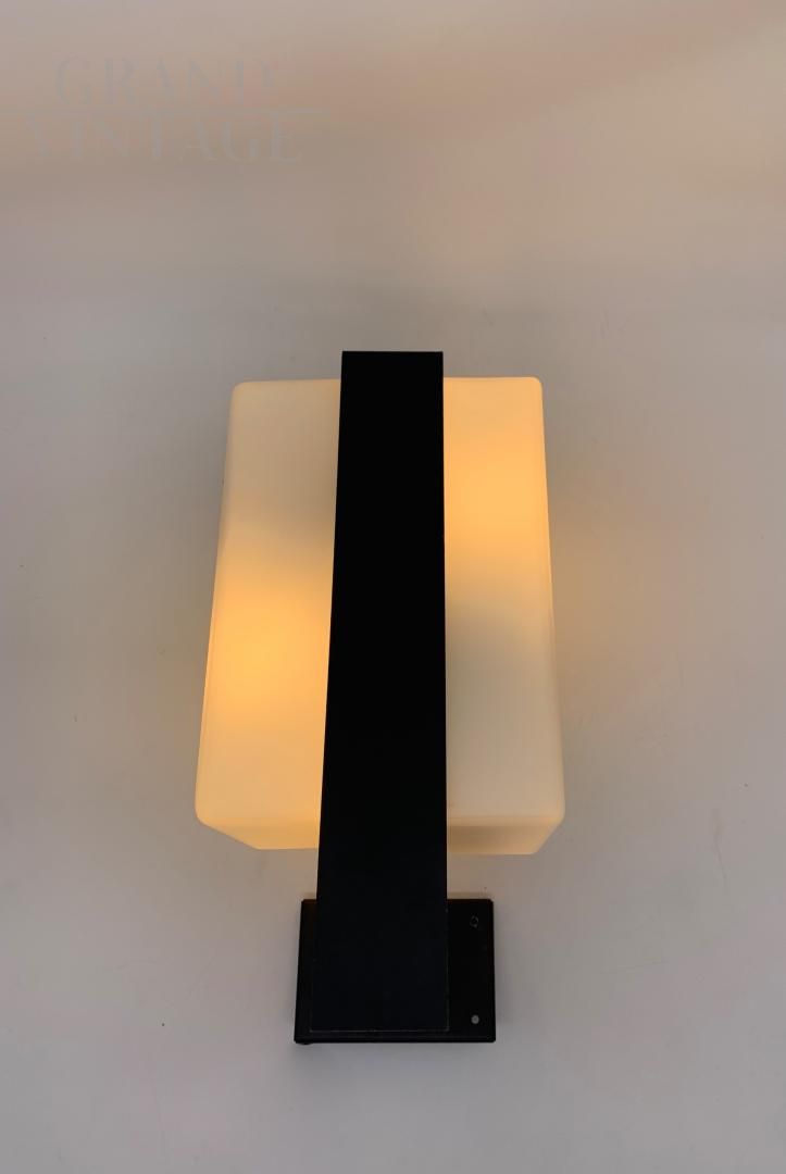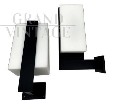 Fantastica coppia di applique anni '50 attribuite a Stilnovo con vetri squadrati di colore bianco latte su struttura in ferro laccato nero, ogni applique ha due attacchi per lampadina E14, adatti anche per l'utilizzo di lampadine a LED. Qualche segno del tempo.