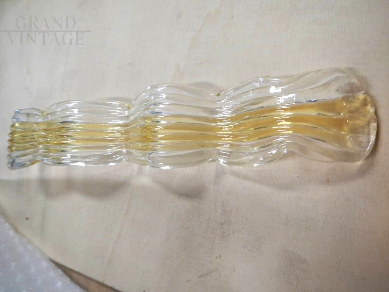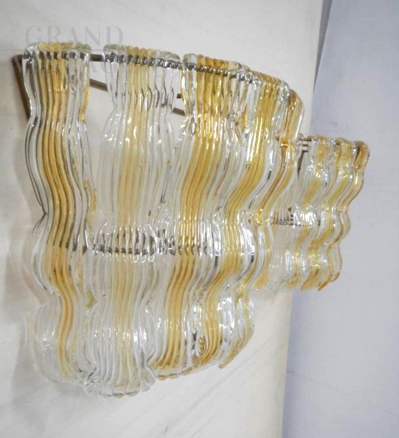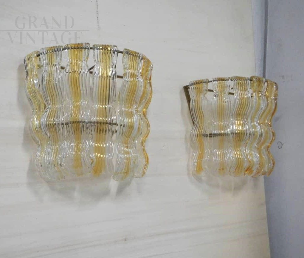 Coppia di applique in vetro di Murano con 8 lastre di vetro ondulato lavorate a mano con colorazione gialla, con supporto in ferro dove appenderle.