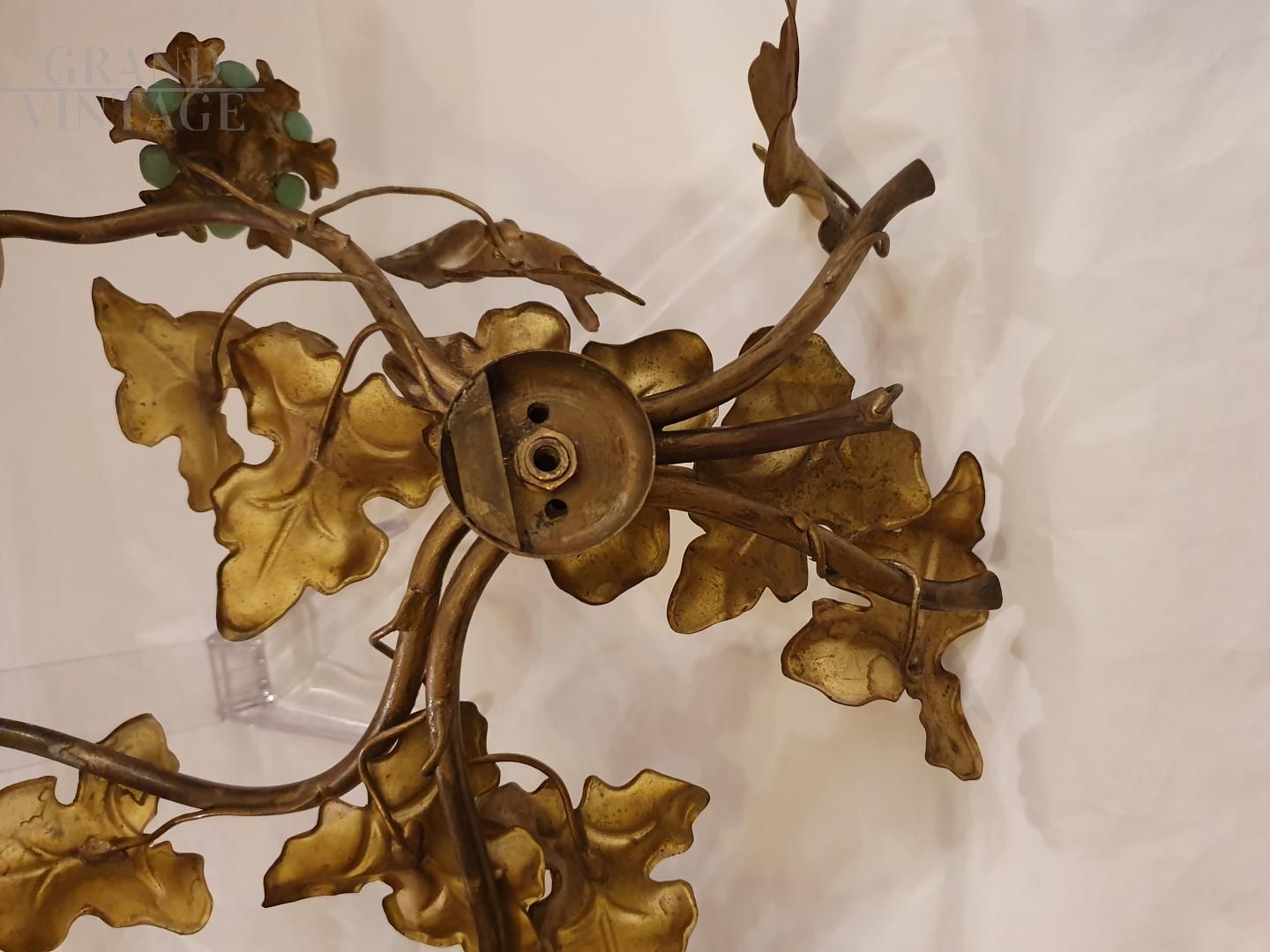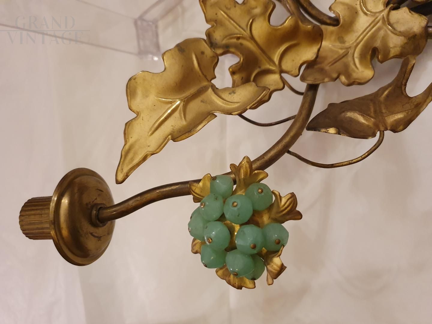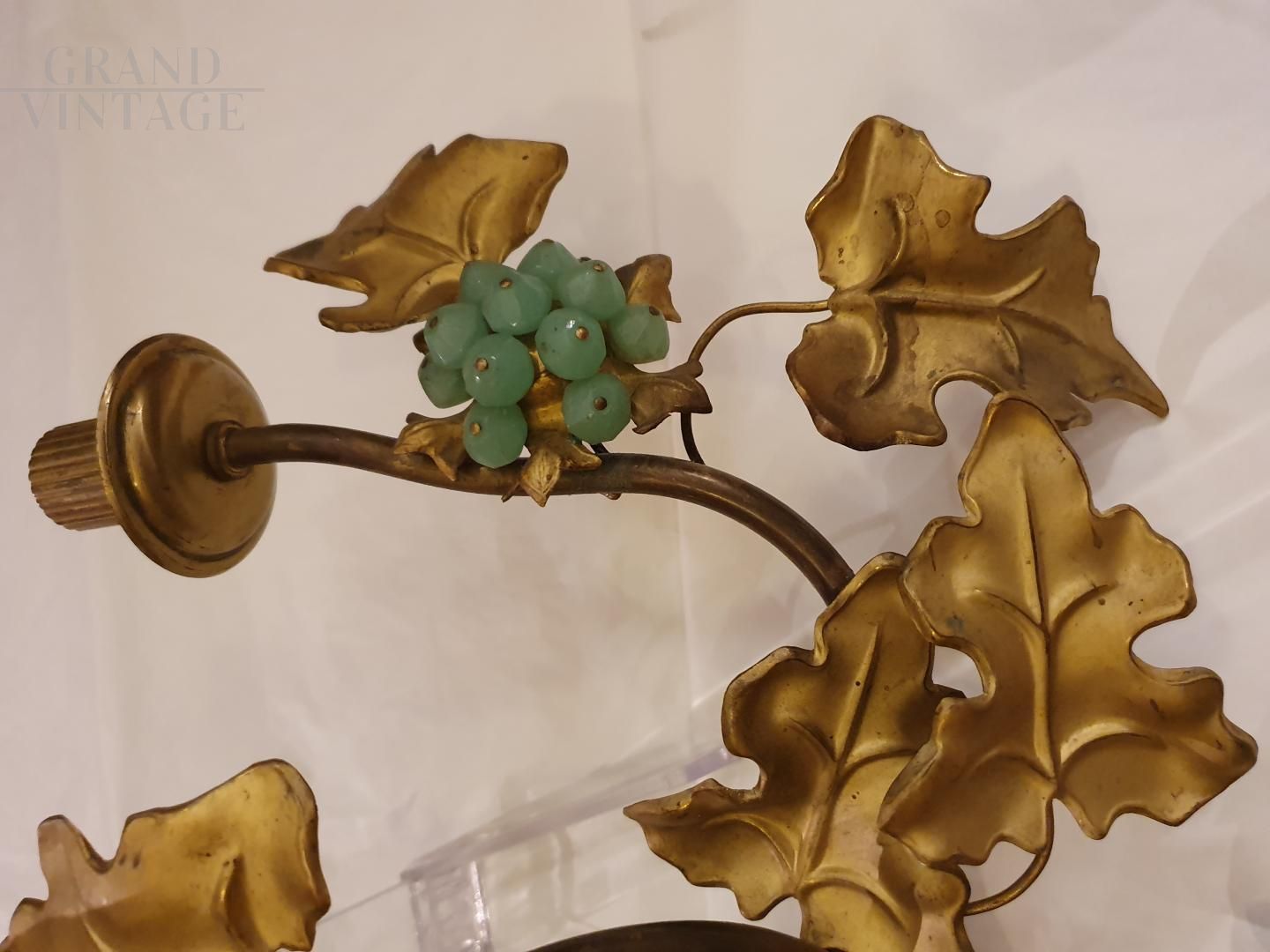 Coppia di applique in ottone con foglie e fiori in pasta di vetro