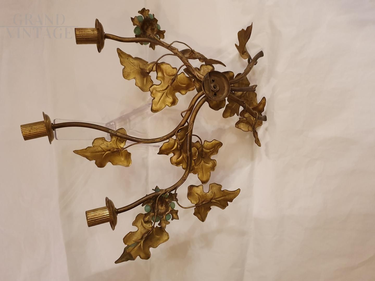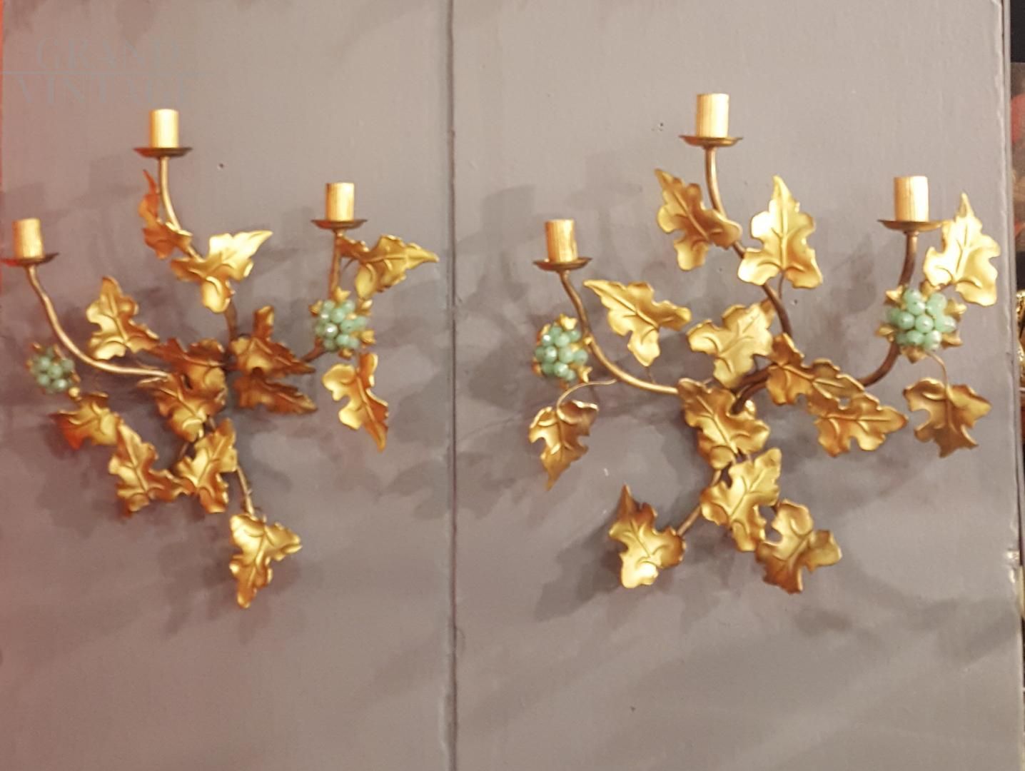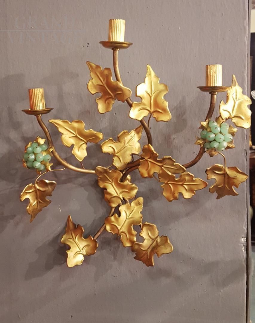 Coppia di applique in ottone con foglie e fiori in pasta di vetro