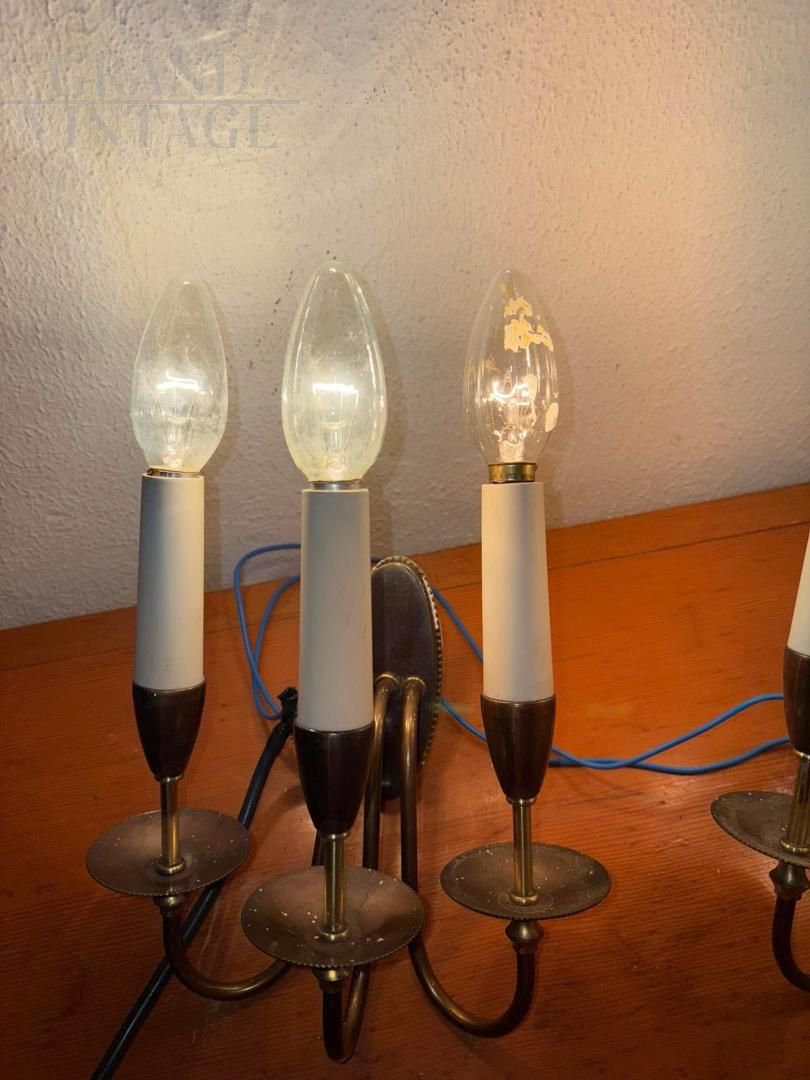 Coppia di applique design di Bruno Chiarini in ottone, ricordano da forma dei candelabri con 3 punti luce a candela, Italia anni '50.