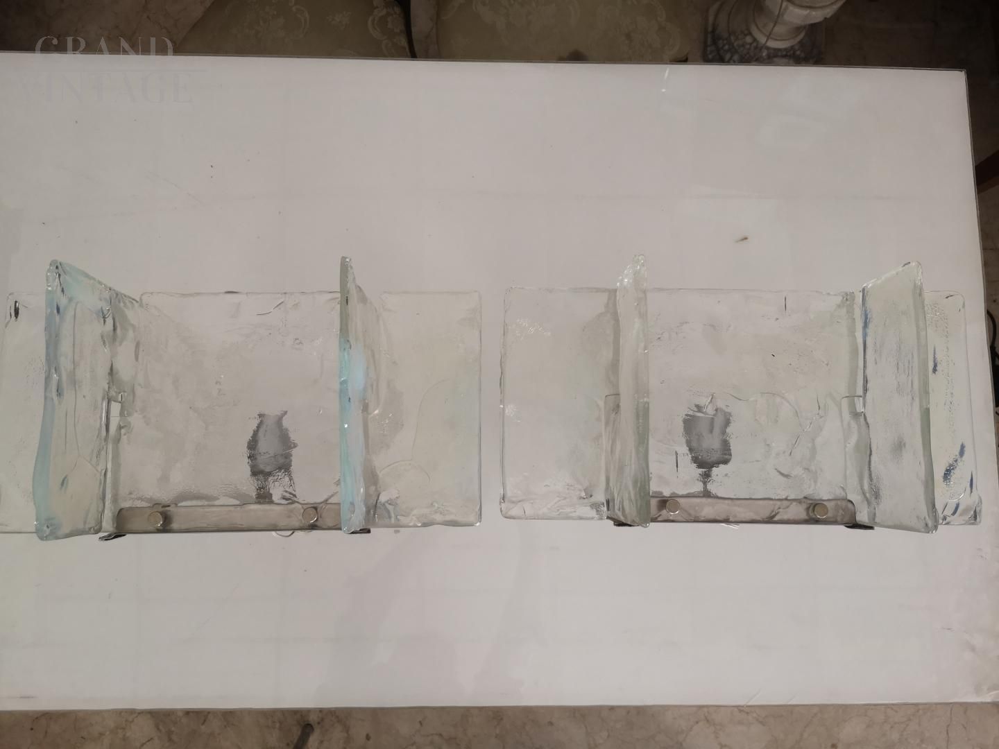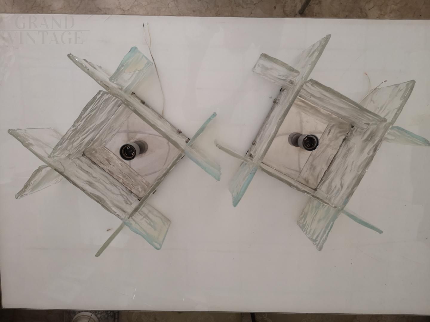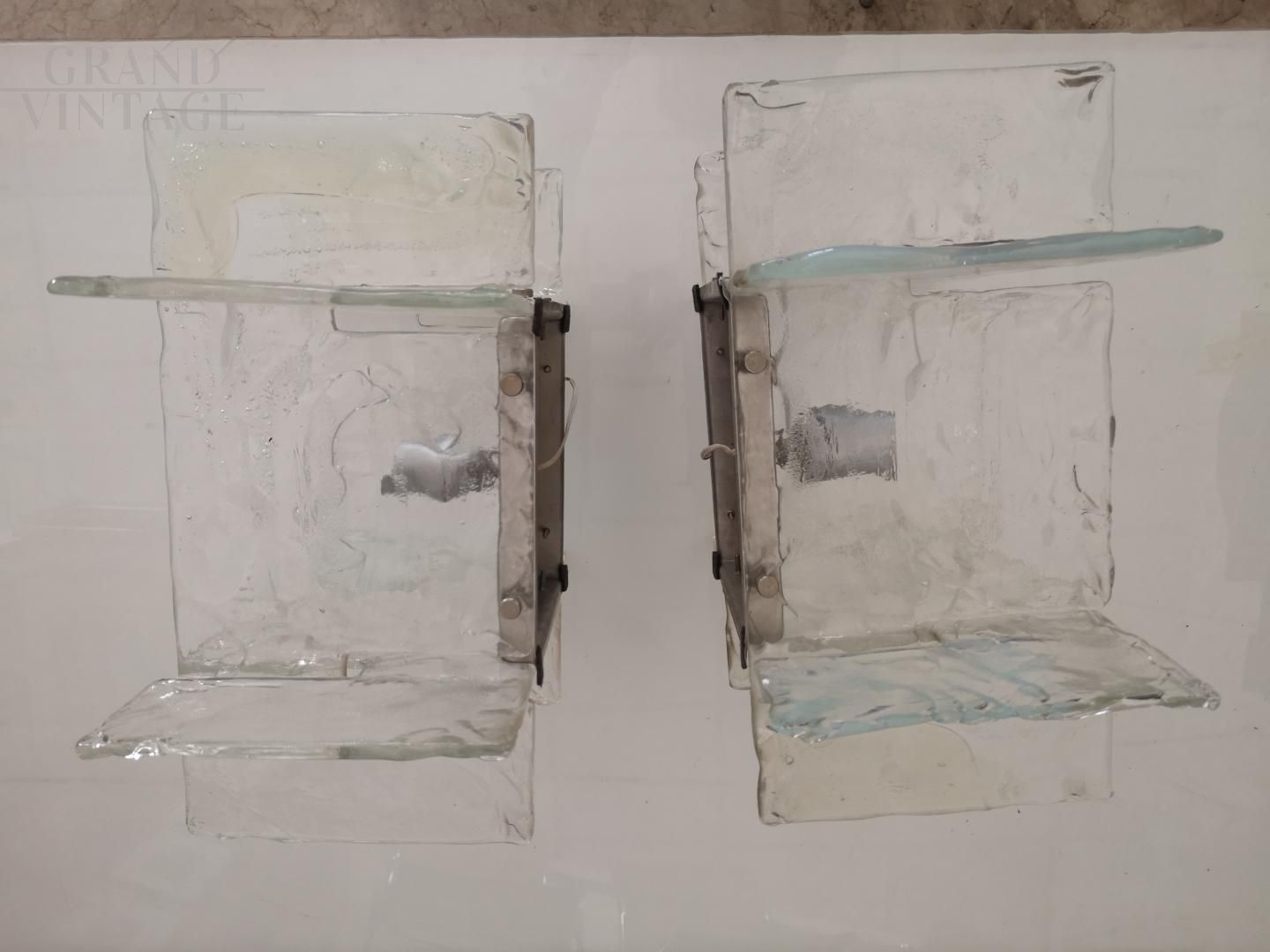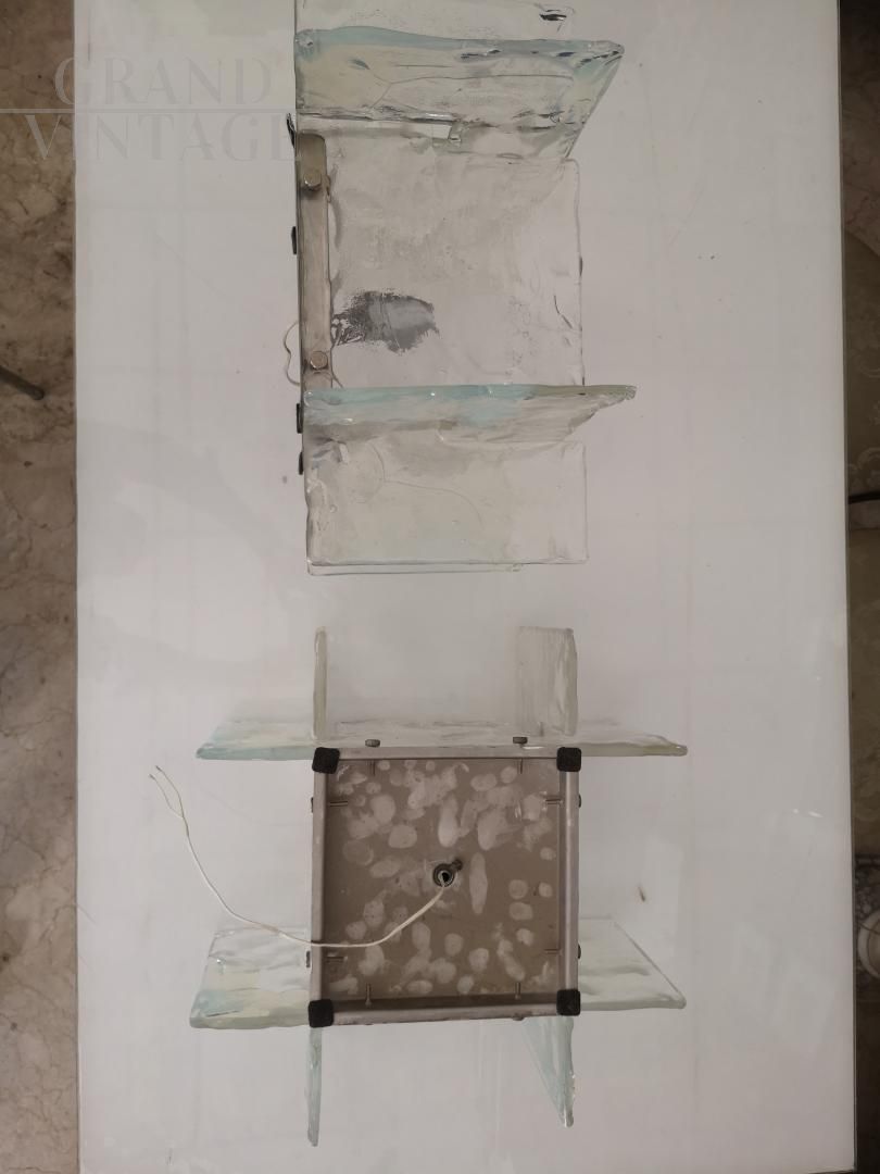Coppia di applique Carlo Nason per Mazzega in vetro di Murano in perfette condizioni, Italia anni '60. Le applique si presentano con una base cromata in acciaio e 4 lastre in vetro di murano sfaccettato trasparente che diffondono la luce.