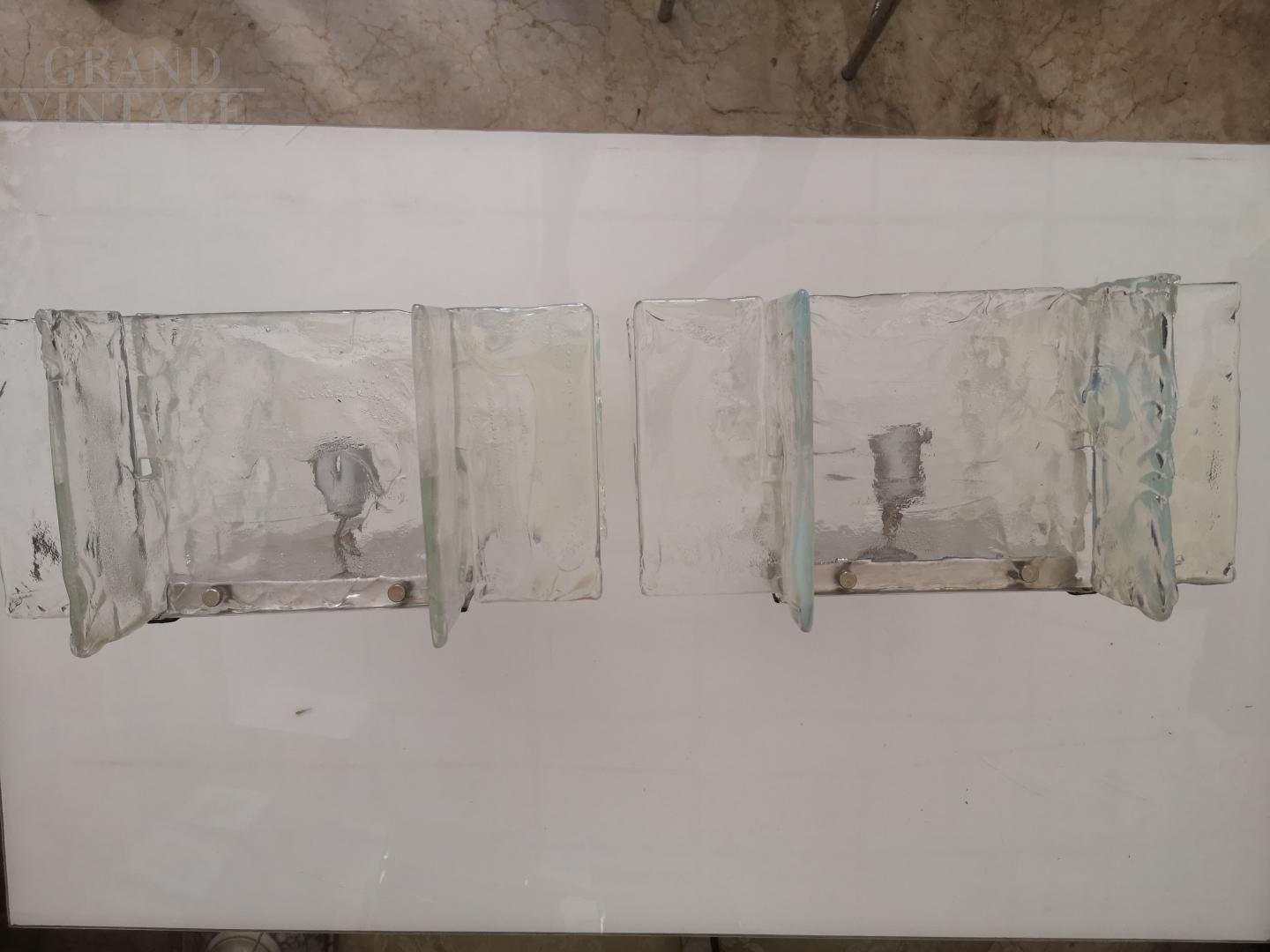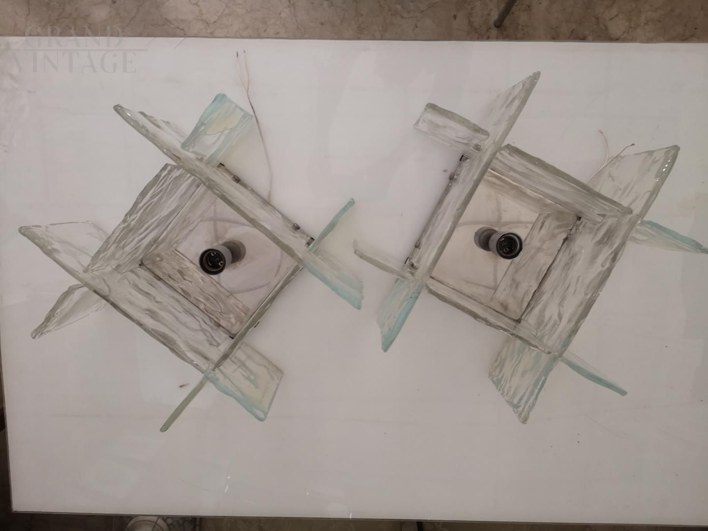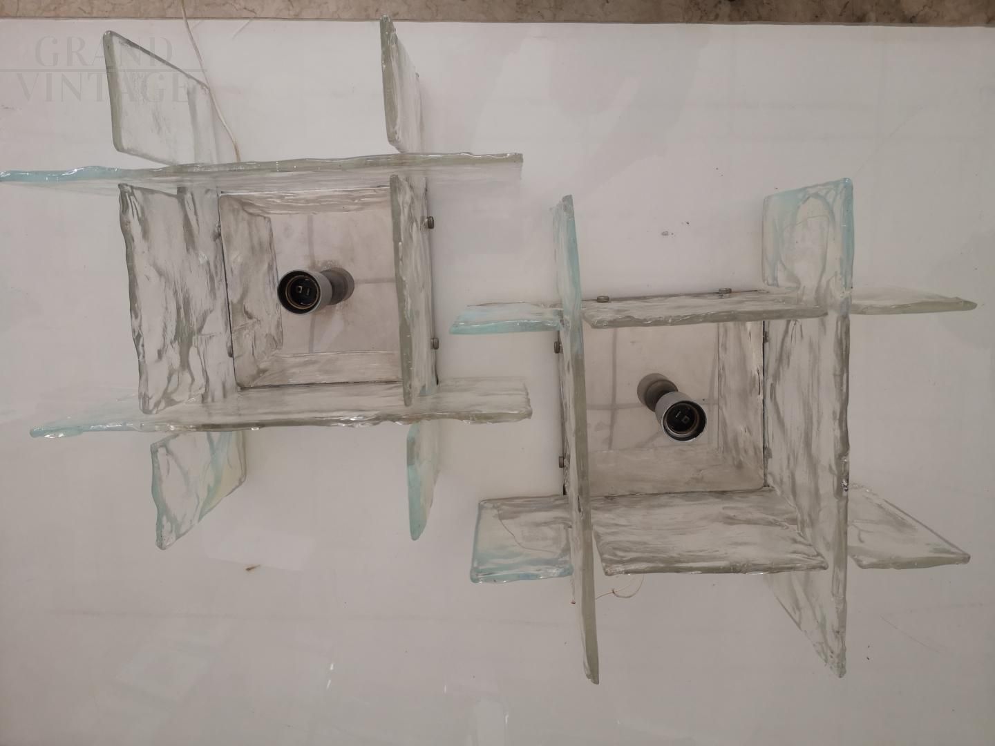 Coppia di applique Carlo Nason per Mazzega in vetro di Murano in perfette condizioni, Italia anni '60. Le applique si presentano con una base cromata in acciaio e 4 lastre in vetro di murano sfaccettato trasparente che diffondono la luce.