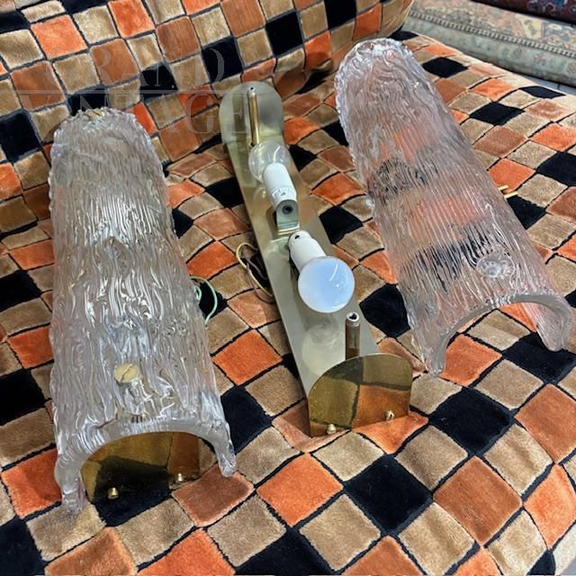 Coppia di applique design di Venini in vetro di Murano modello corteccia, Italia anni '60. Il vetro artistico è soffiato a mano lavorato effetto corteccia, con rifiniture in ottone dorato. Facili da appendere, ciascuna applique contiene una doppia luce. Ottimo stato di conservazione, pronte da appendere. Disponibili due coppie!