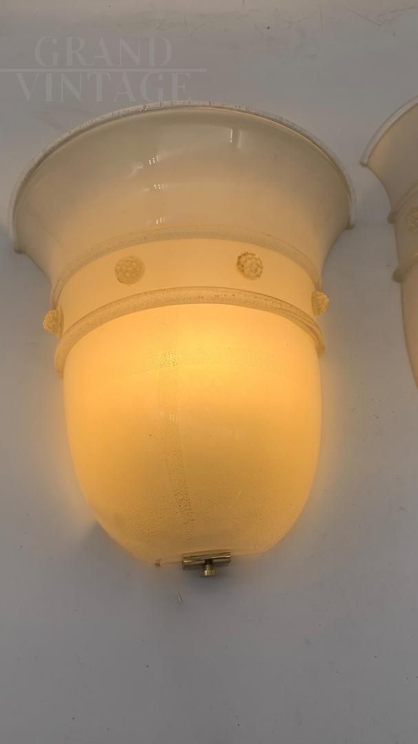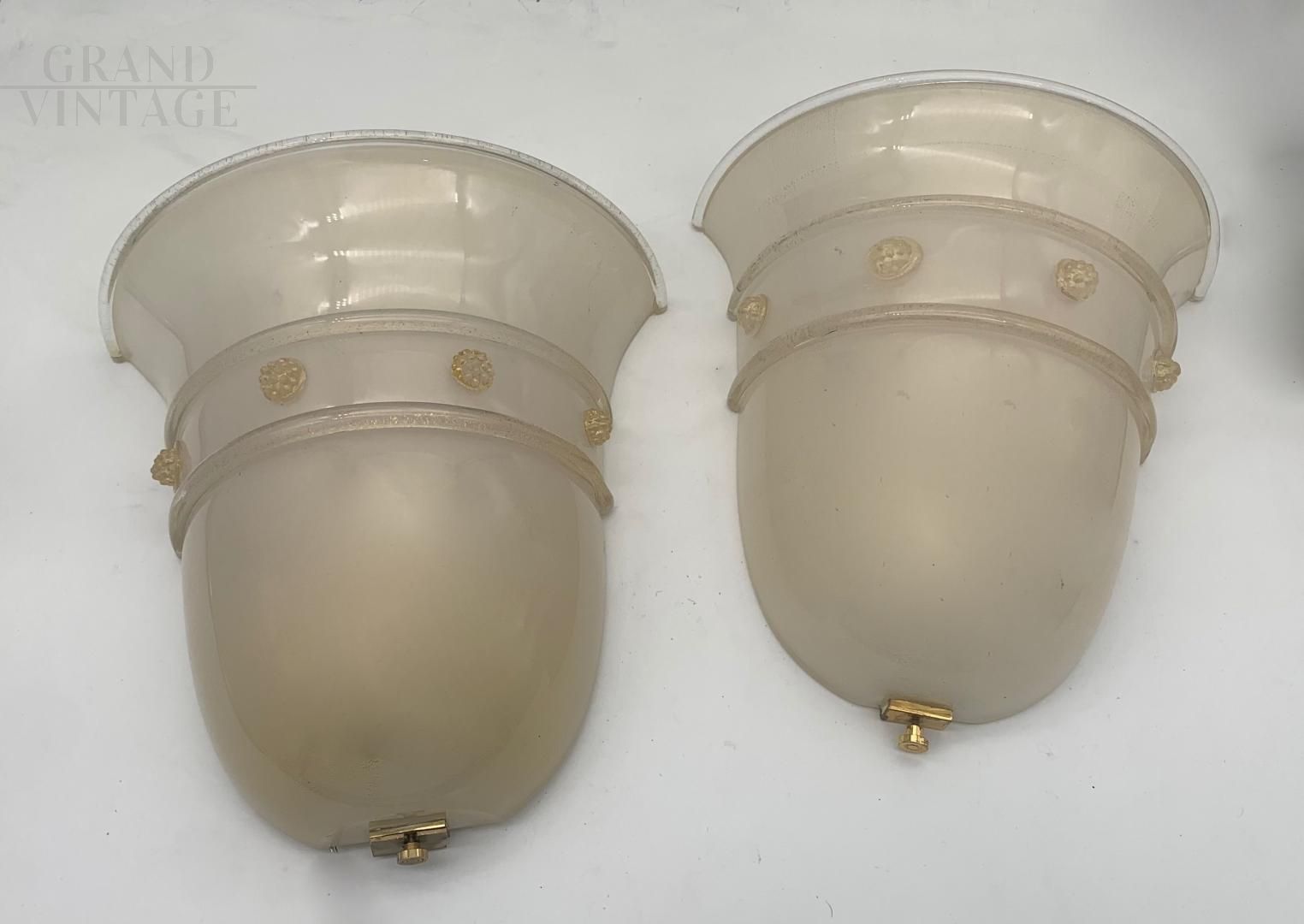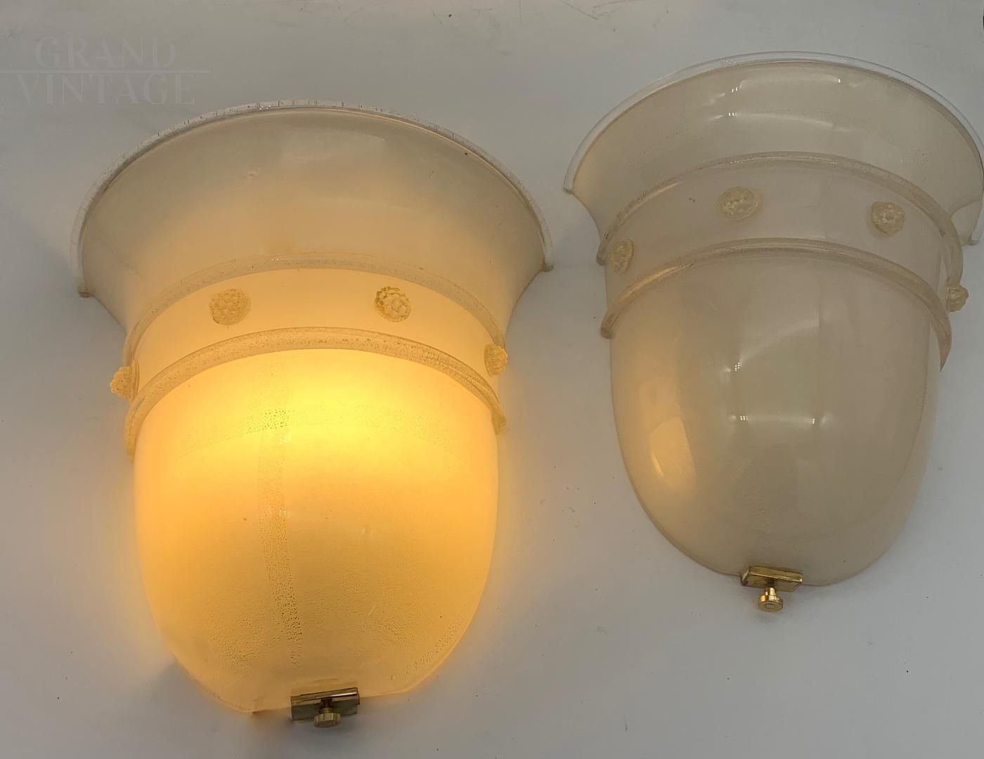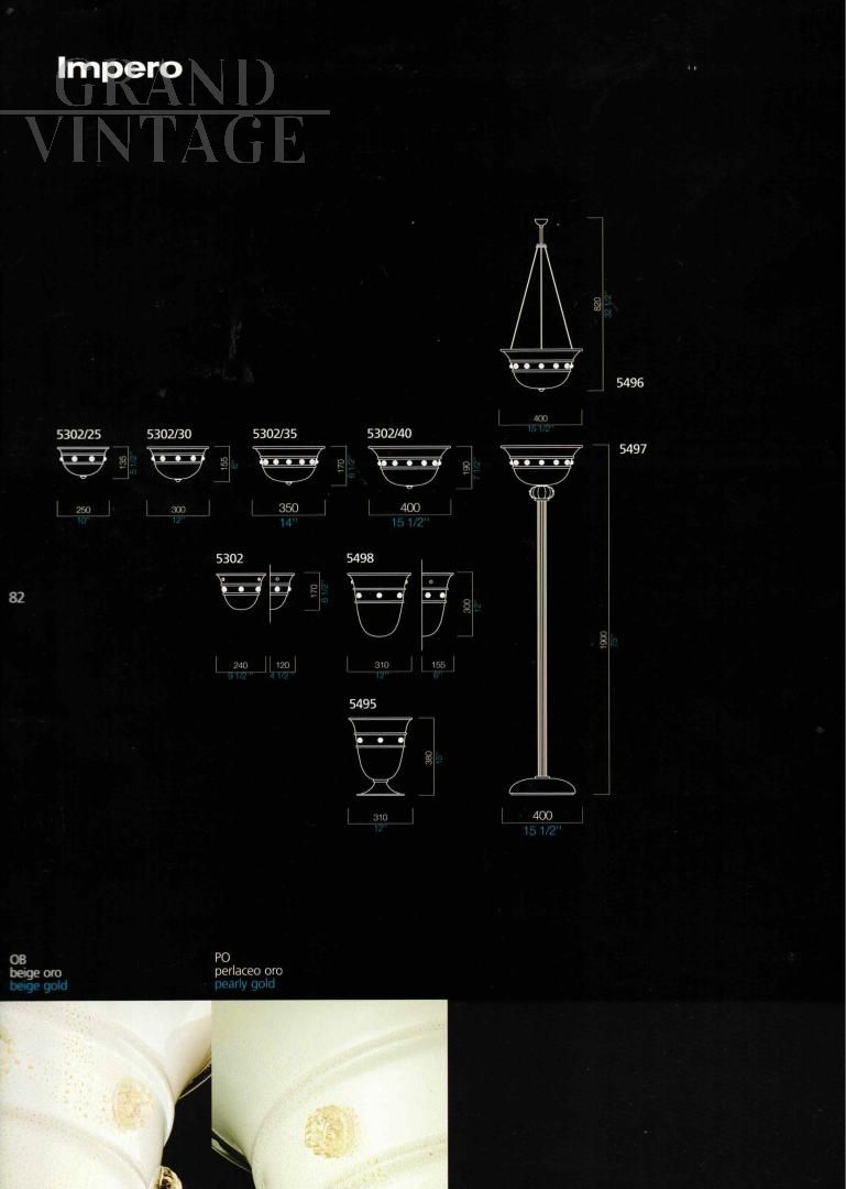 Fantastica coppia di applique originali modello Impero della ditta Barovier & Toso del 2008, in foto è visibile la pagina di catalogo in cui sono inserite. Applique a muro in vetro soffiato di forma semisferica con bordo superiore svasato decorate con piccoli motivi floreali applicati esternamente. Il vetro è lavorato con tecnica della soffiatura su stampo e con color trasparente e in foglia oro. Una delle due applique in foto è accesa e diffonde una luce calda mentre l'altra è spenta evidenziando la trasparenza del materiale. Montatura della lampada in ottone con un portalampada e 27. Impianto elettrico nuovo.