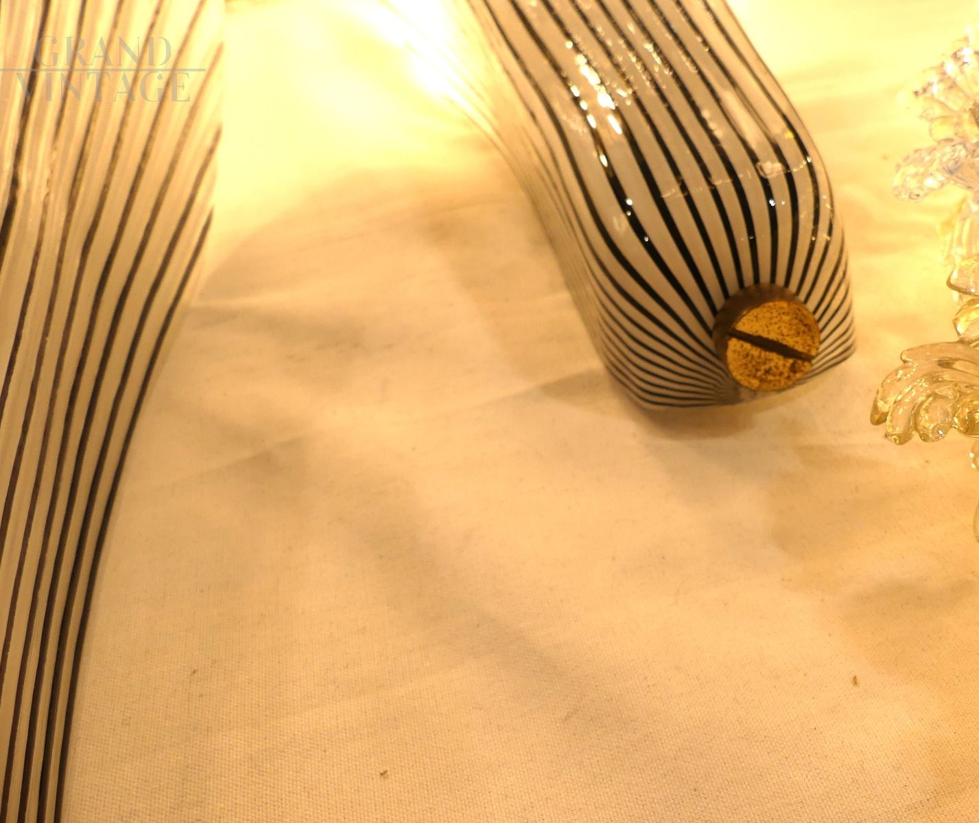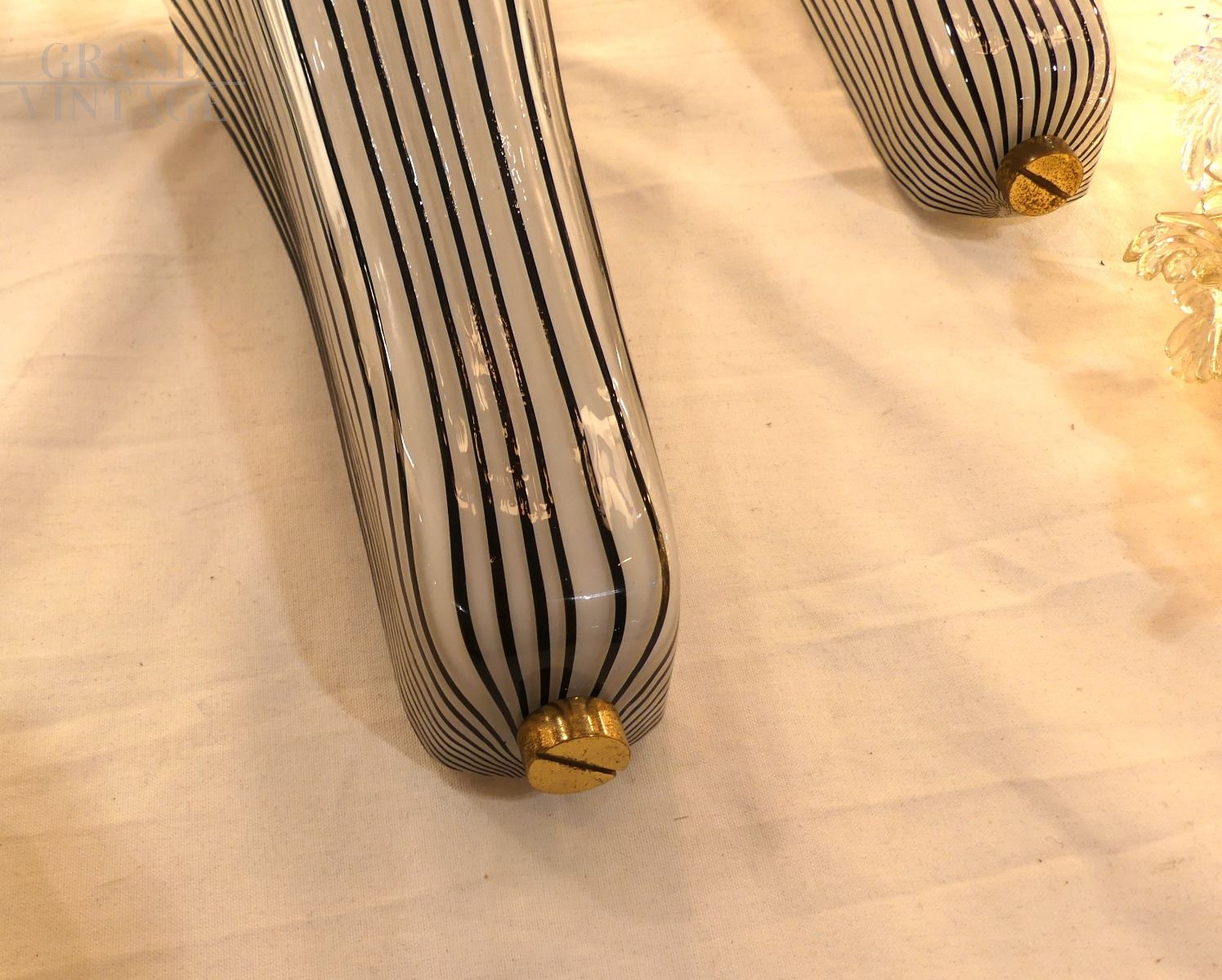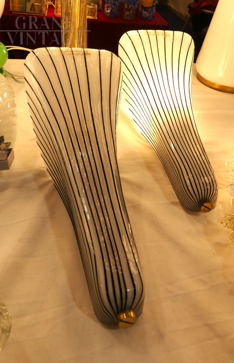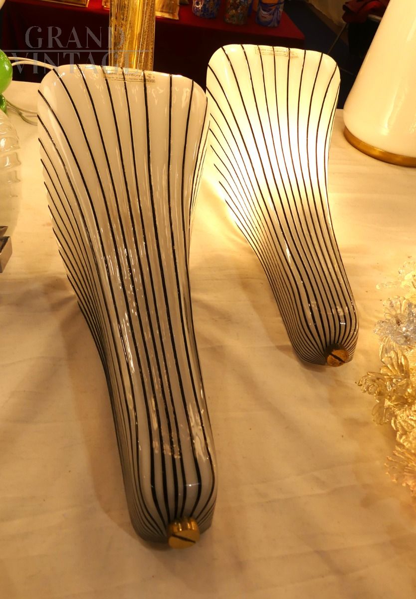 Coppia di applique in vetro di Murano con adesivo originale Effetre, il vetro è di colore bianco con righe nere effetto gessato. Eleganti e moderne, sono in ottime condizioni e funzionanti.