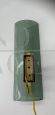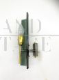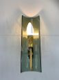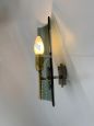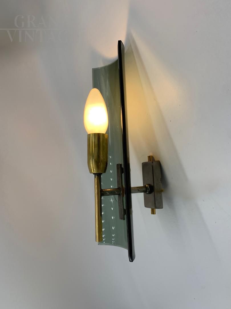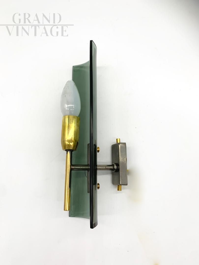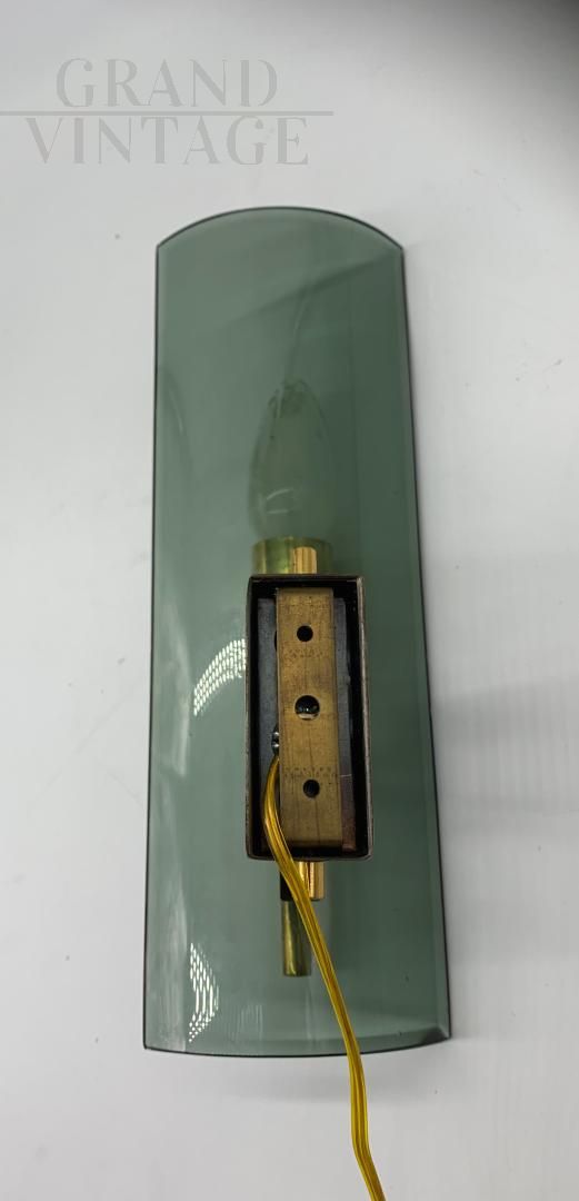 Coppia di applique lampade da parete Veca vintage in vetro fumé su struttura in ferro, molto particolari, in buone condizioni, un vetro è leggermente sbeccato centralmente, non ci sono crepe. Impianto elettrico rifatto a nuovo con attacco per lampadina E14, adatto anche per lampadine a LED. Il Colore dei vetri è fumé tendente al verde scuro.