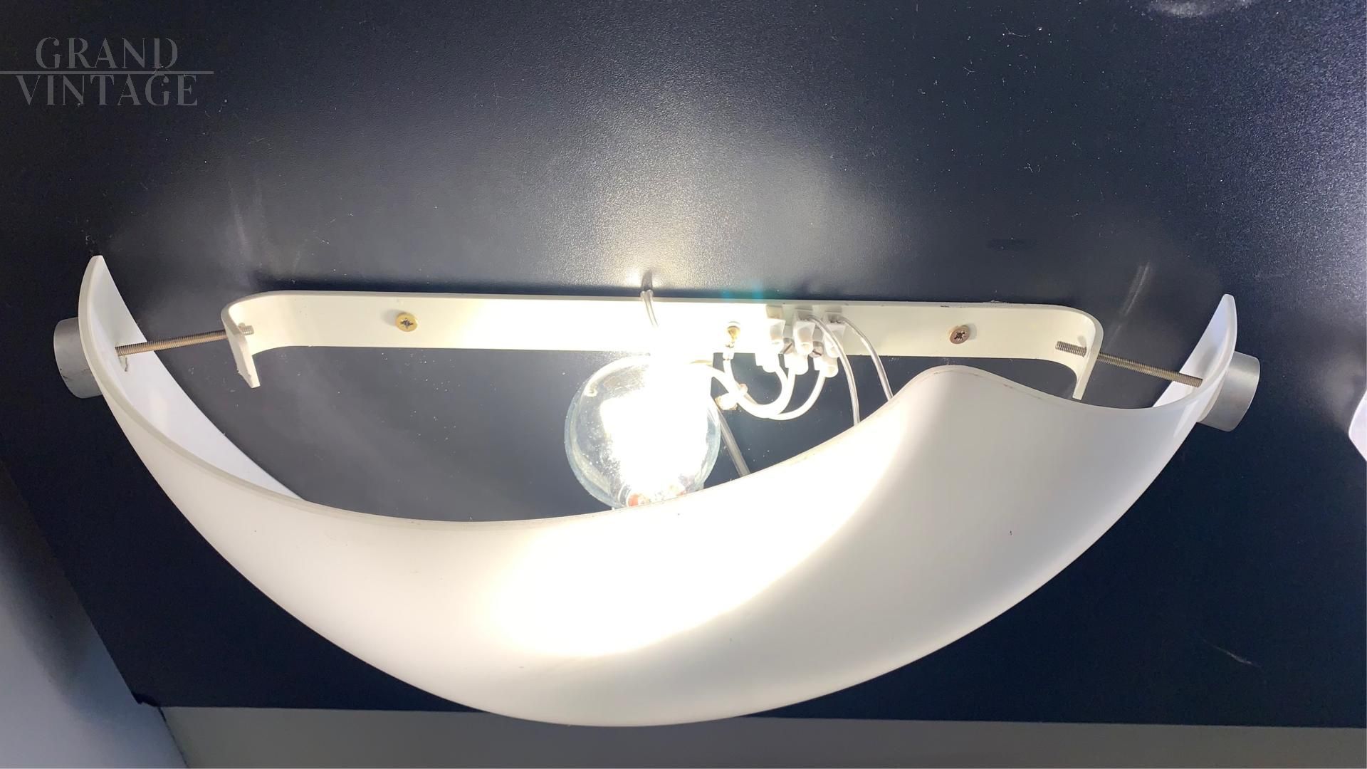 Coppia di lampade da parete applique Mezzamarubia della ditta Vistosi in vetro di Murano bianco latte leggermente tendente al crema, su struttura in metallo. Le applique sono ion ottime condizioni, con vetri senza difetti e non crepati, impianto elettrico nuovo, 1 punto luce con porta lampadina di tipo E27. Applique dal design raffinato e molto particolare, il bollino della ditta ne certifica l'originalità.