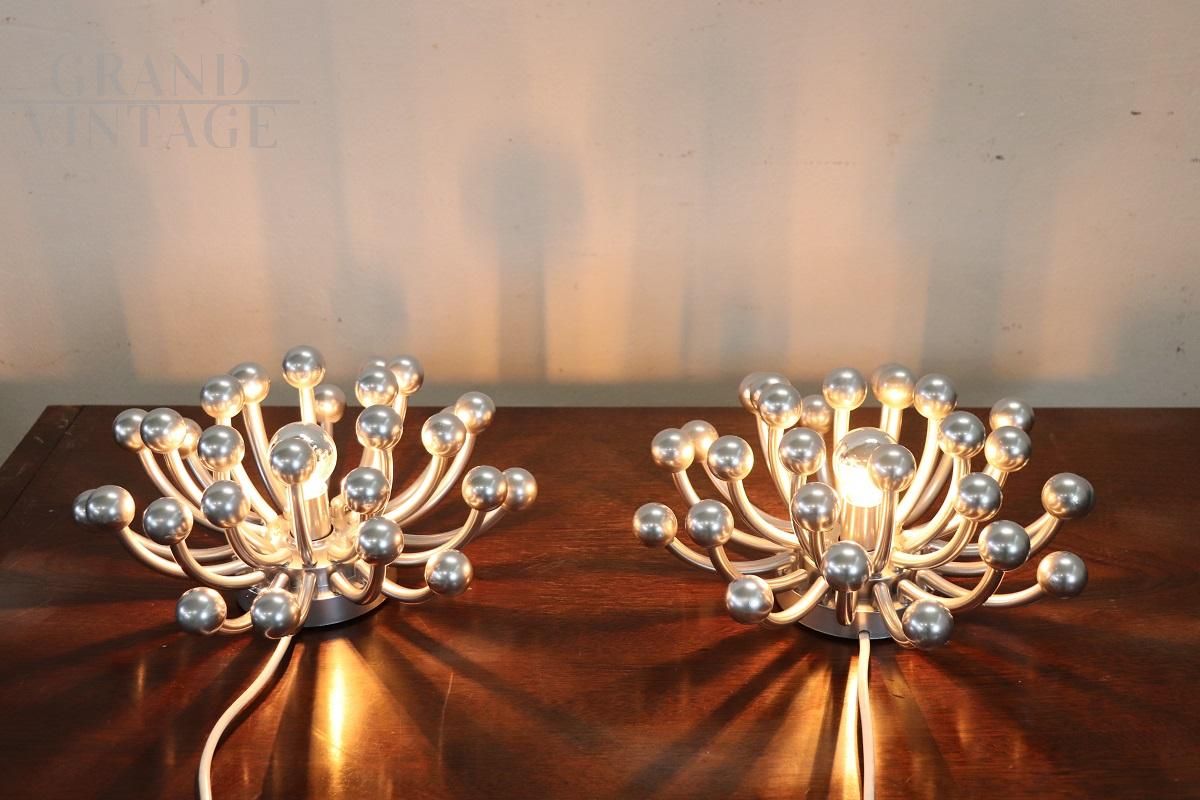 Straordinaria coppia di lampade design italiano 1970, con marchio di fabbrica Valenti & C. sotto la base. Modello Pistillo disegnato dallo Studio Tetrach. Le condizioni sono eccellenti, l'impianto elettrico è stato ricablato per un utilizzo immediato. Il loro design ispirato al pistillo dei fiori è una fantastica opera d'arte di design che trae ispirazione dalla natura. La lampadina posizionata al centro, una volta accesa, irradia la luce attraverso i pistilli creando un effetto scenografico davvero sorprendente! Tutti i vostri ospiti saranno felici di vedere questa lampada. Potete scegliere di posizionarle a parete, su un tavolino da caffè o di utilizzarle sui comodini. Ovunque decidiate di posizionarle, queste lampade italiane diventeranno il punto focale della stanza.