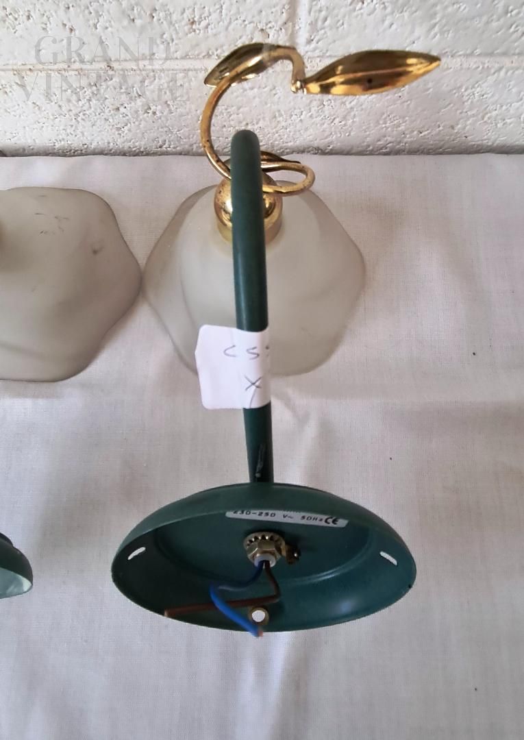 Coppia di applique vintage realizzate da Rossini Illuminazione, modello A3788, in vetro satinato su struttura in metallo laccato verde con decori di foglie dorate.