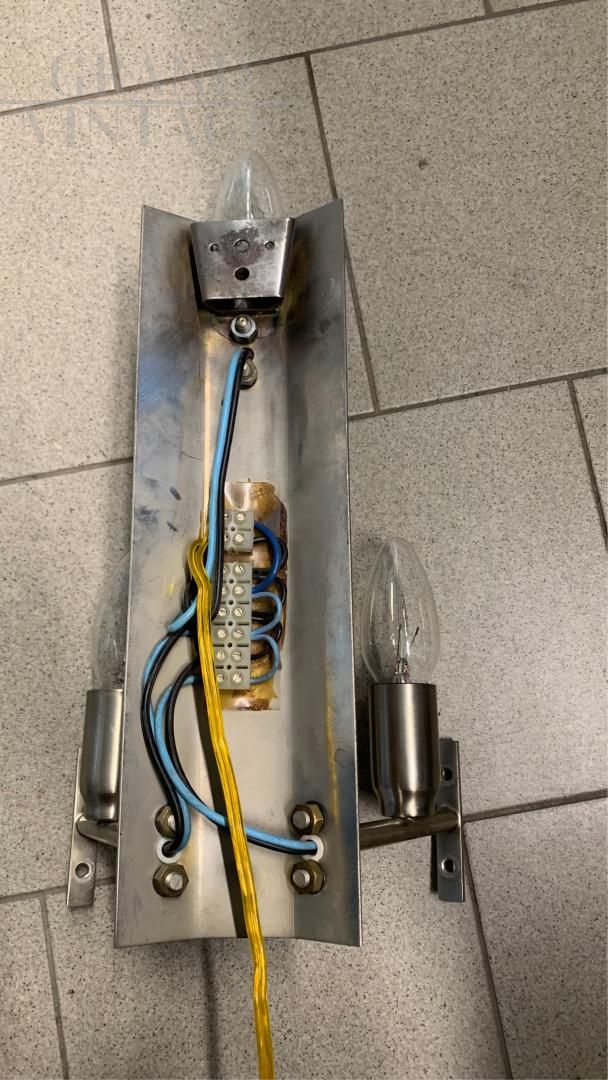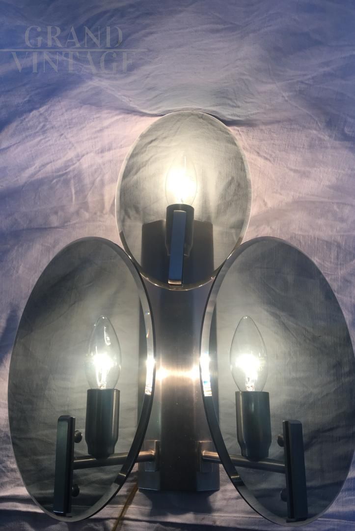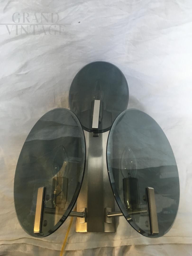 Coppia di lampade da parete applique Veca con tre punti luce, con dischi in vetro fumé molato su struttura in ferro e ottone, molto particolari, in buone condizioni, con vetri non crepati. Impianto elettrico rifatto a nuovo con tre attacchi per lampadine E14, adatto anche per lampadine a LED. Il colore dei vetri è fumé tendente al verde scuro.