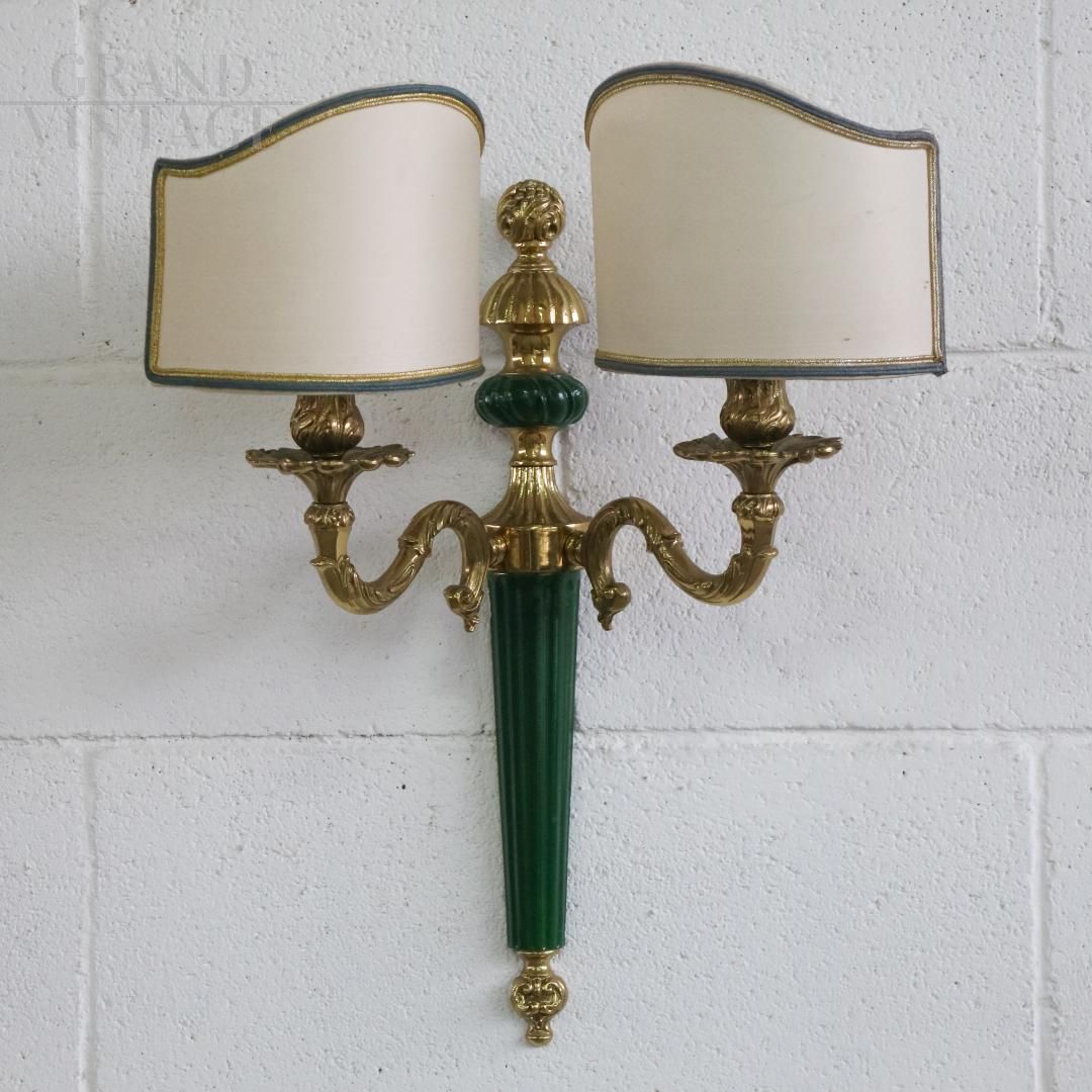 Coppia di applique vintage in ottone a 2 luci, del XX secolo, con struttura e bracci in ottone dorato e laccatura verde bottiglia, paralume in tessuto rigido bianco con bordatura in fettuccia verde-oro.