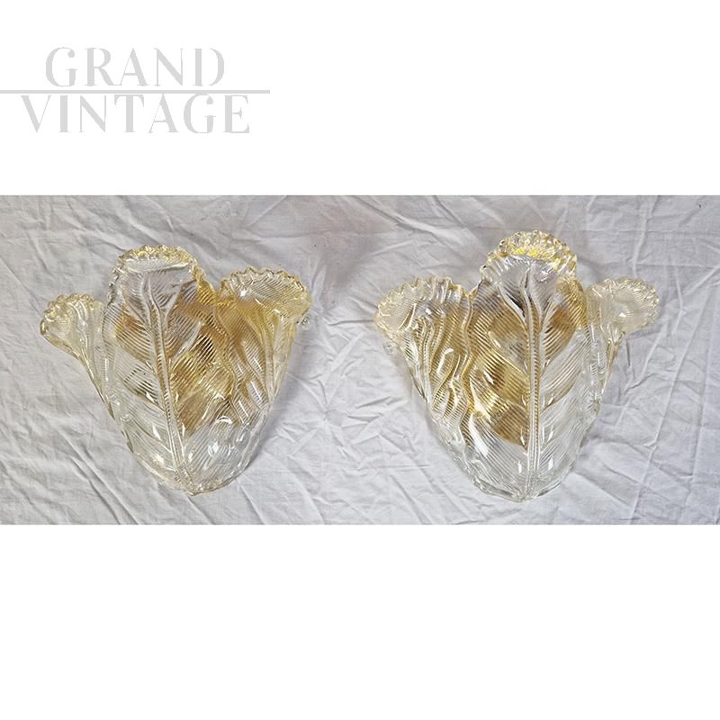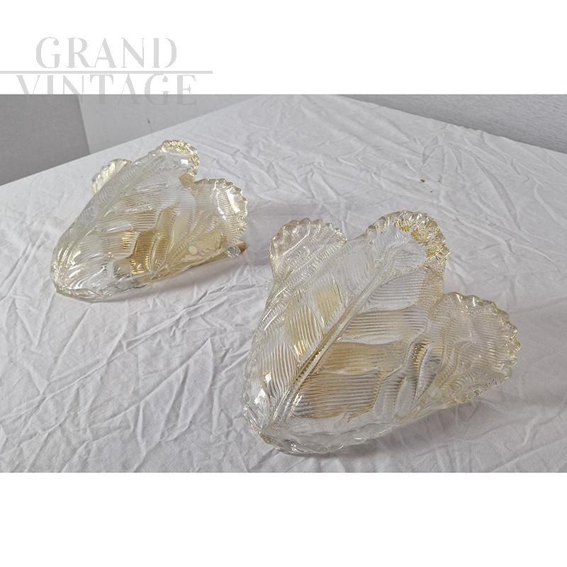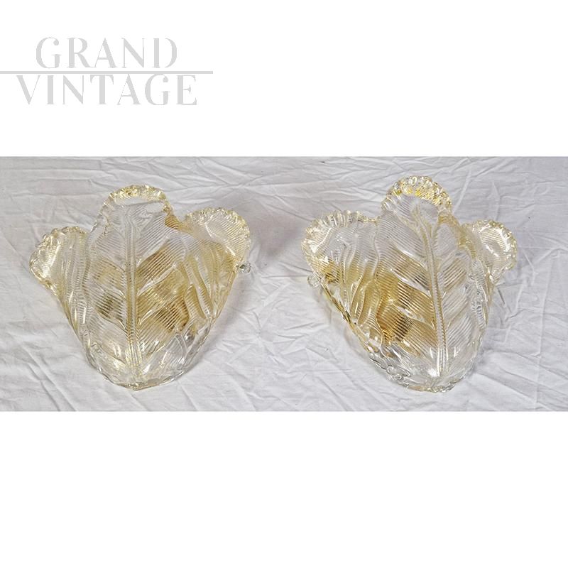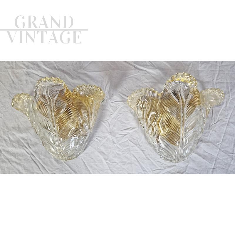 Coppia di appliques in vetro di Murano lavorato a foglie di colore trasparente con sfumature dorate.