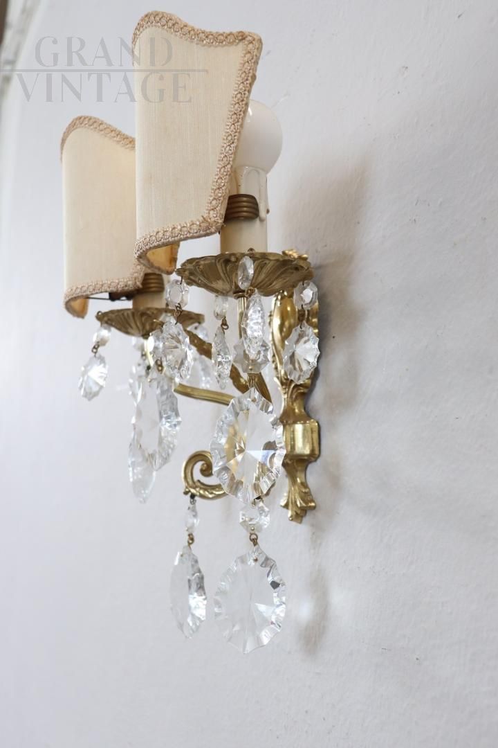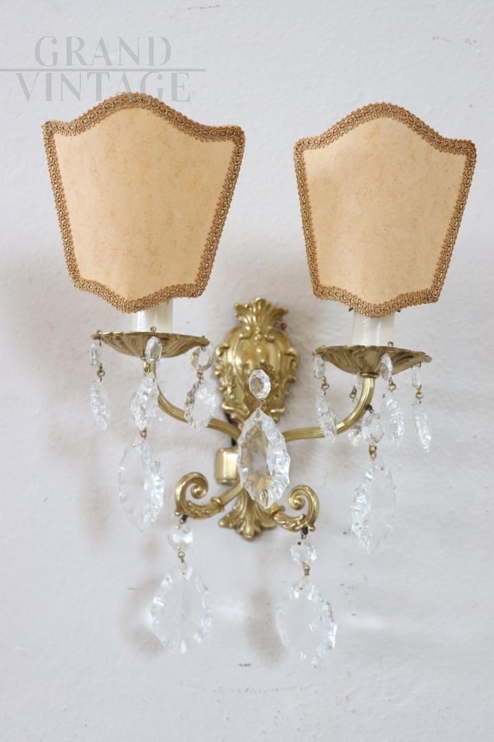 Realizzate in bronzo dorato finemente cesellato, ogni applique presenta un design classico con due bracci graziosamente curvati che sostengono due lampadine, completate da scintillanti gocce di cristallo che aggiungono un tocco di lusso e interesse visivo. Ogni braccio è ornato da un piccolo paralume realizzato con tessuti diversi. Si può scegliere di mantenere il tessuto su ogni applique per un look affascinante ed eclettico se collocate in stanze separate, oppure di sostituire i tessuti per un aspetto coordinato. Gli impianti elettrici sono stati recentemente ricablati per garantire sicurezza e funzionalità. Prezzo trattabile.