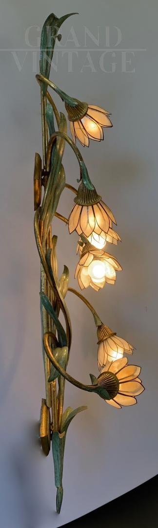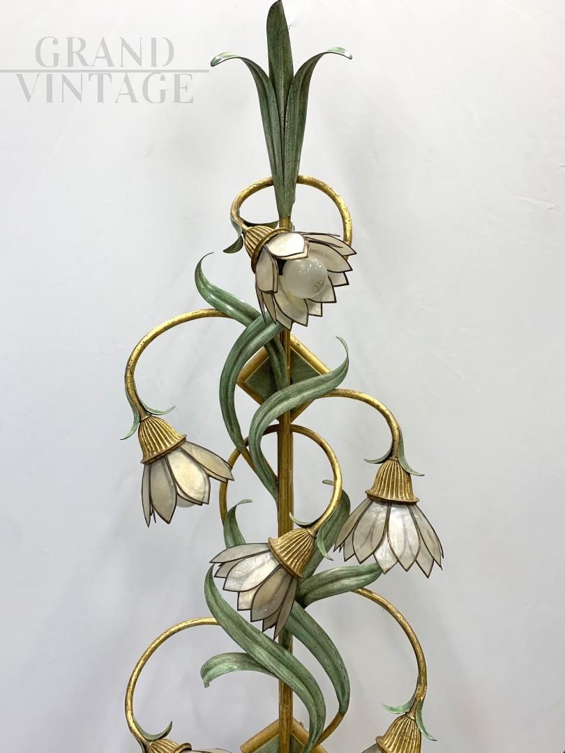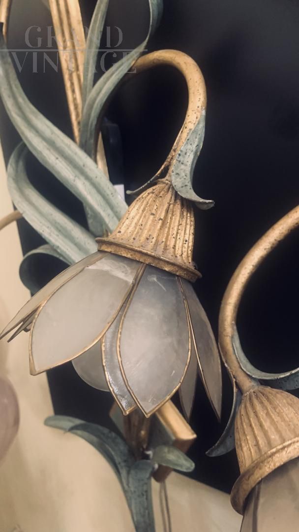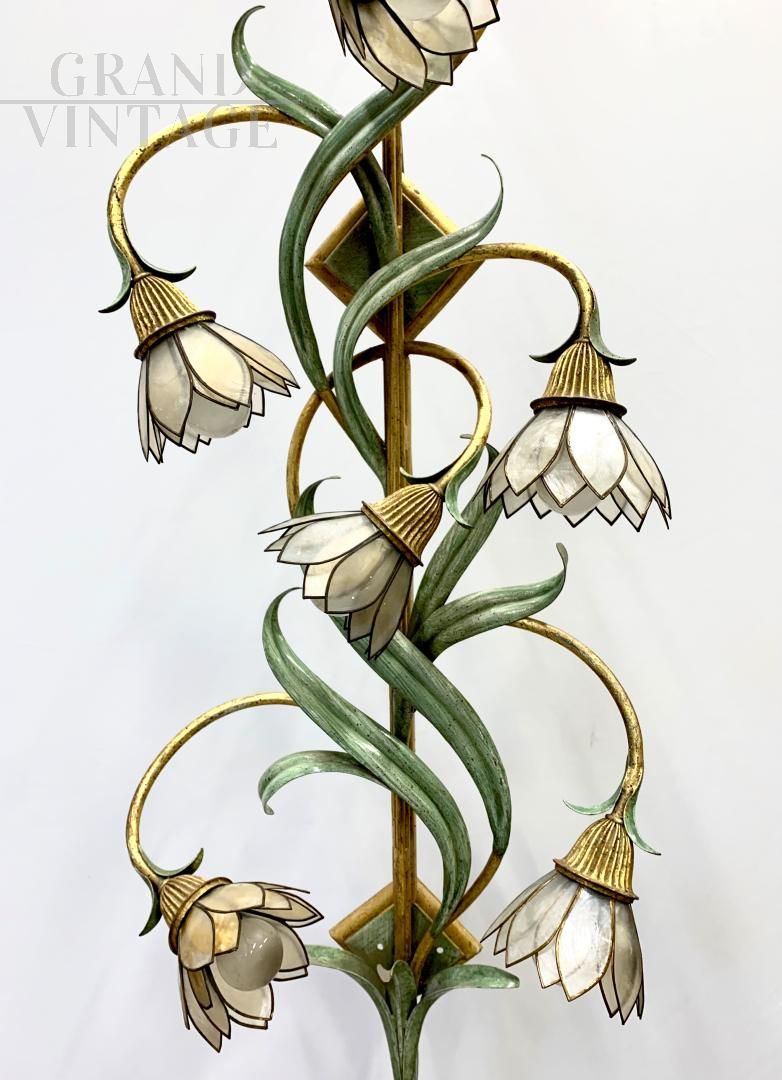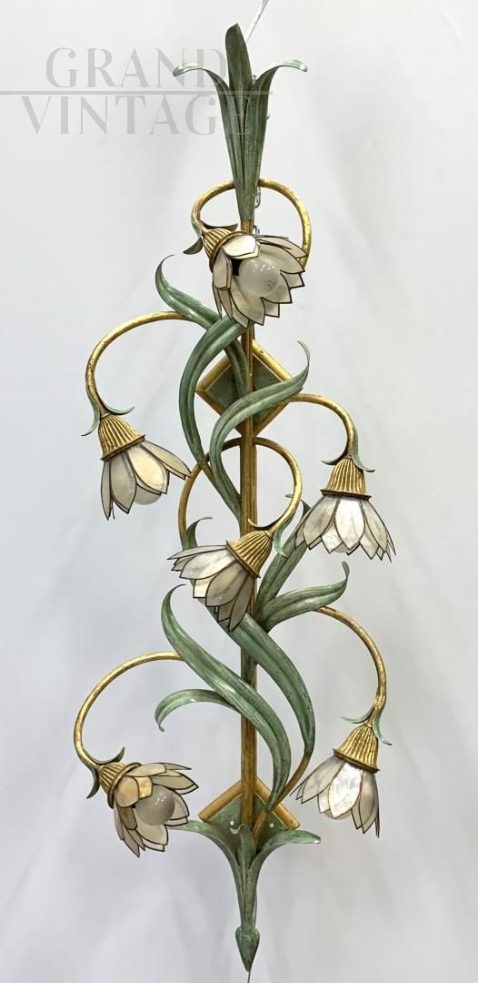 Coppia di lampade anni '70 molto particolari della ditta Banci, con corpo metallico in ferro battuto dipinto a mano, ciascuna con fiori con petali di madreperla. In buone condizioni, presentano i naturali segni del tempo, in particolare sono presenti piccole mancanze o imperfezioni nei petali. Ogni lampada ha 6 attacchi per lampadine di tipo E14. I fiori saranno smontati e incartati adeguatamente per un trasporto sicuro.