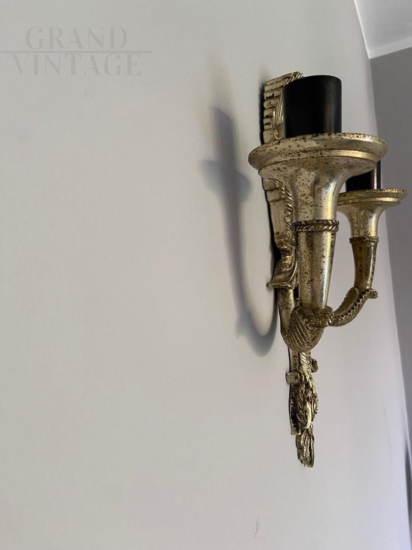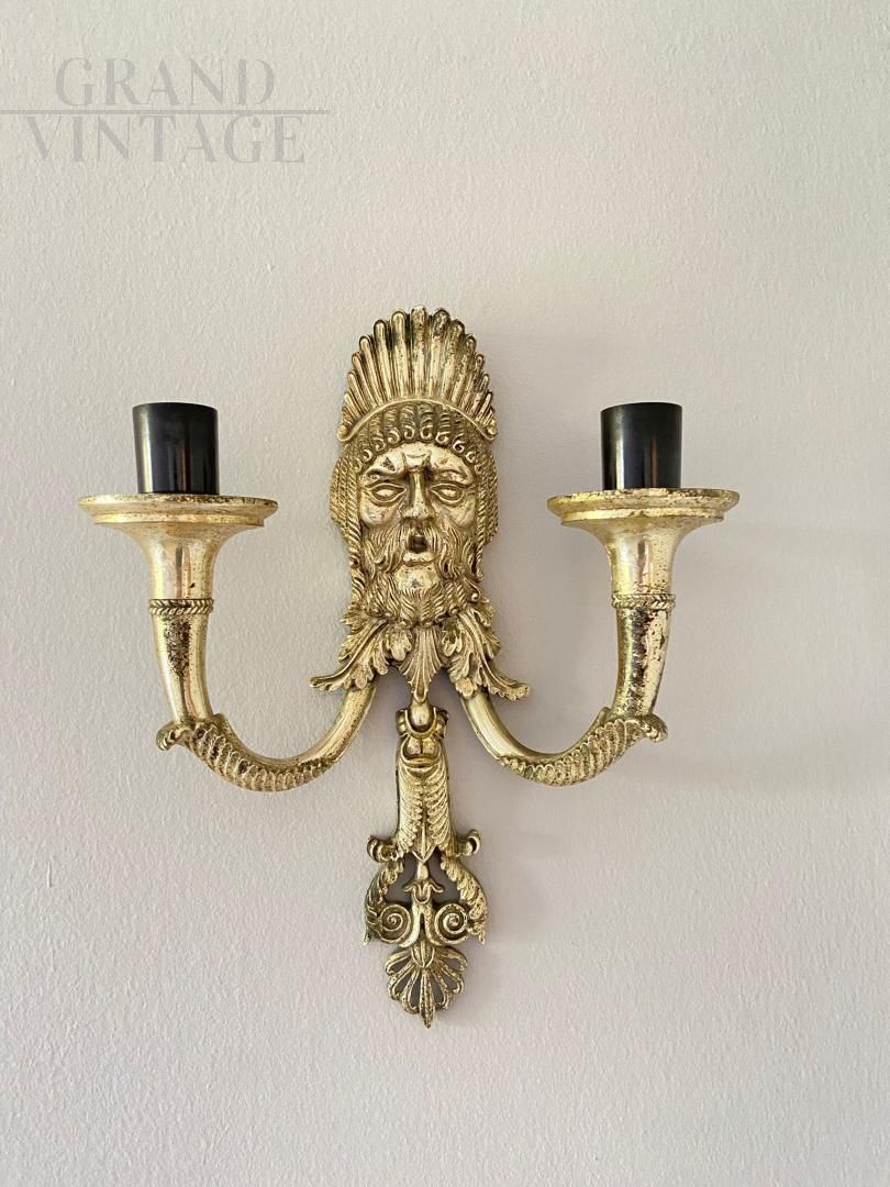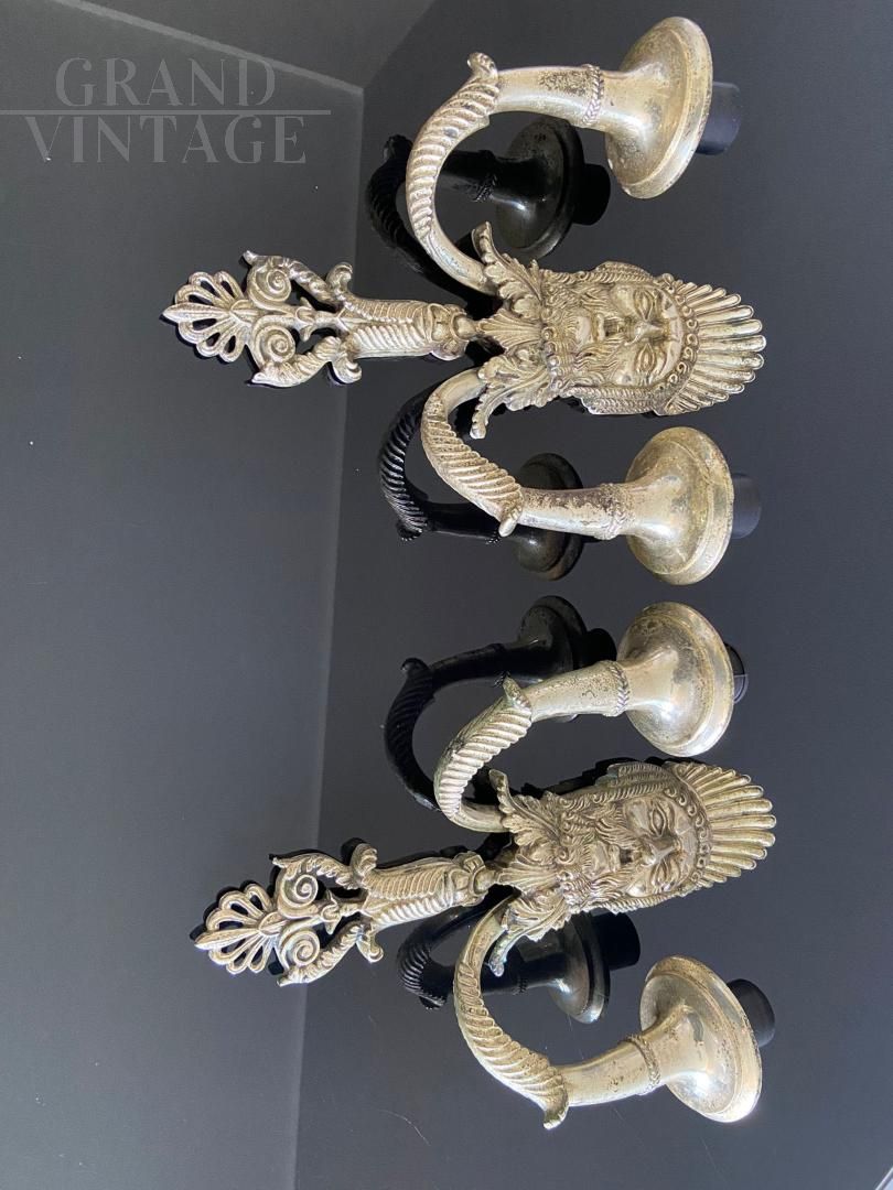 Appliques lampade da parete in stile antica Grecia con mascherone della tragedia greca in lega fusa argentata, in ottimo stato di conservazione, molto scenografici sia per i materiali che per quello che rappresentano.