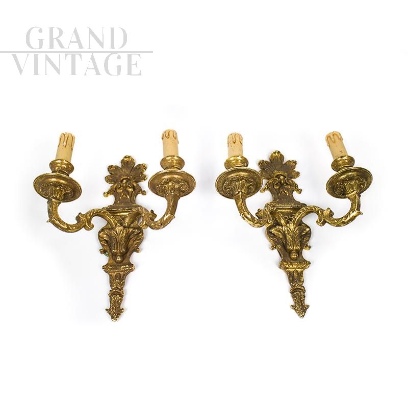 Coppia di appliques lampade da parete in stile barocco antico in ottone dorato finemente lavorato, in ottime condizioni, impianto elettrico funzionante.