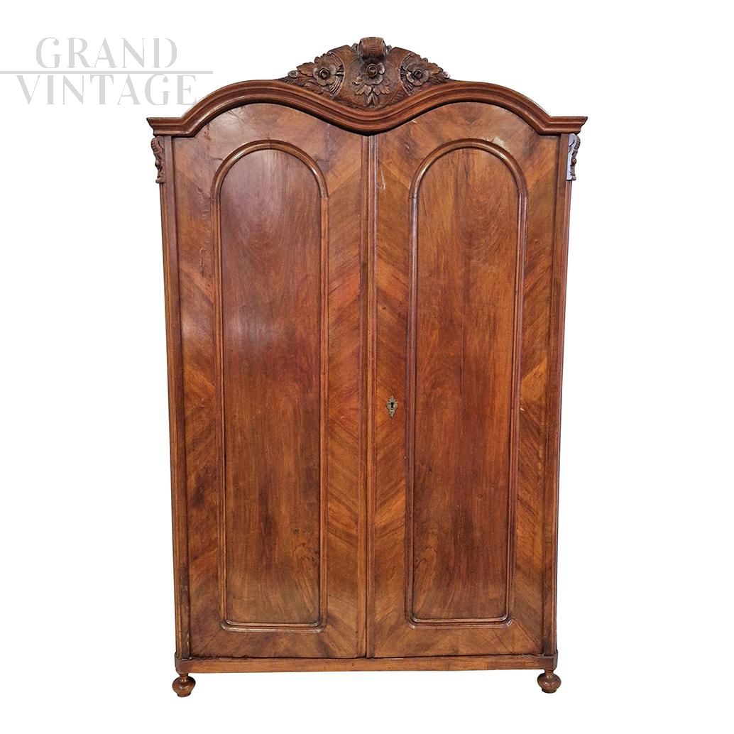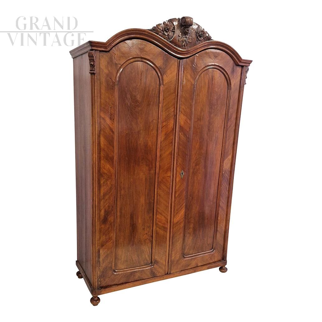 Coppia di armadi gemelli antichi dell'800 a due ante, realizzati in noce con motivo intagliato sulla cappa centrale superiore. Gli armadi sono caratterizzati da un pratico appendiabiti nella parte destra e da tre ripiani nella parte sinistra