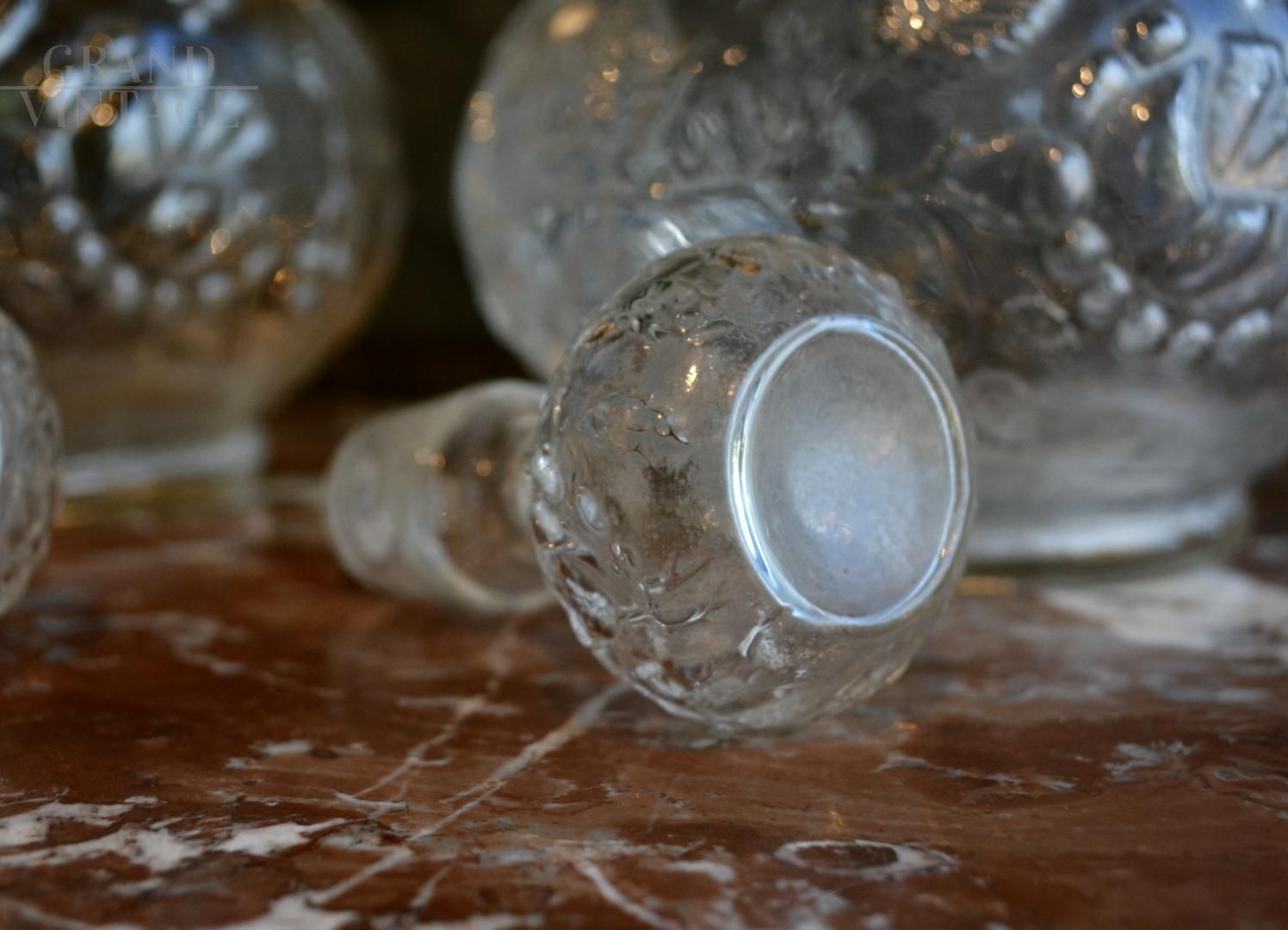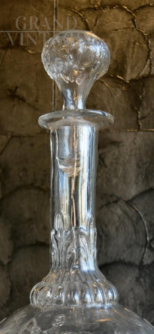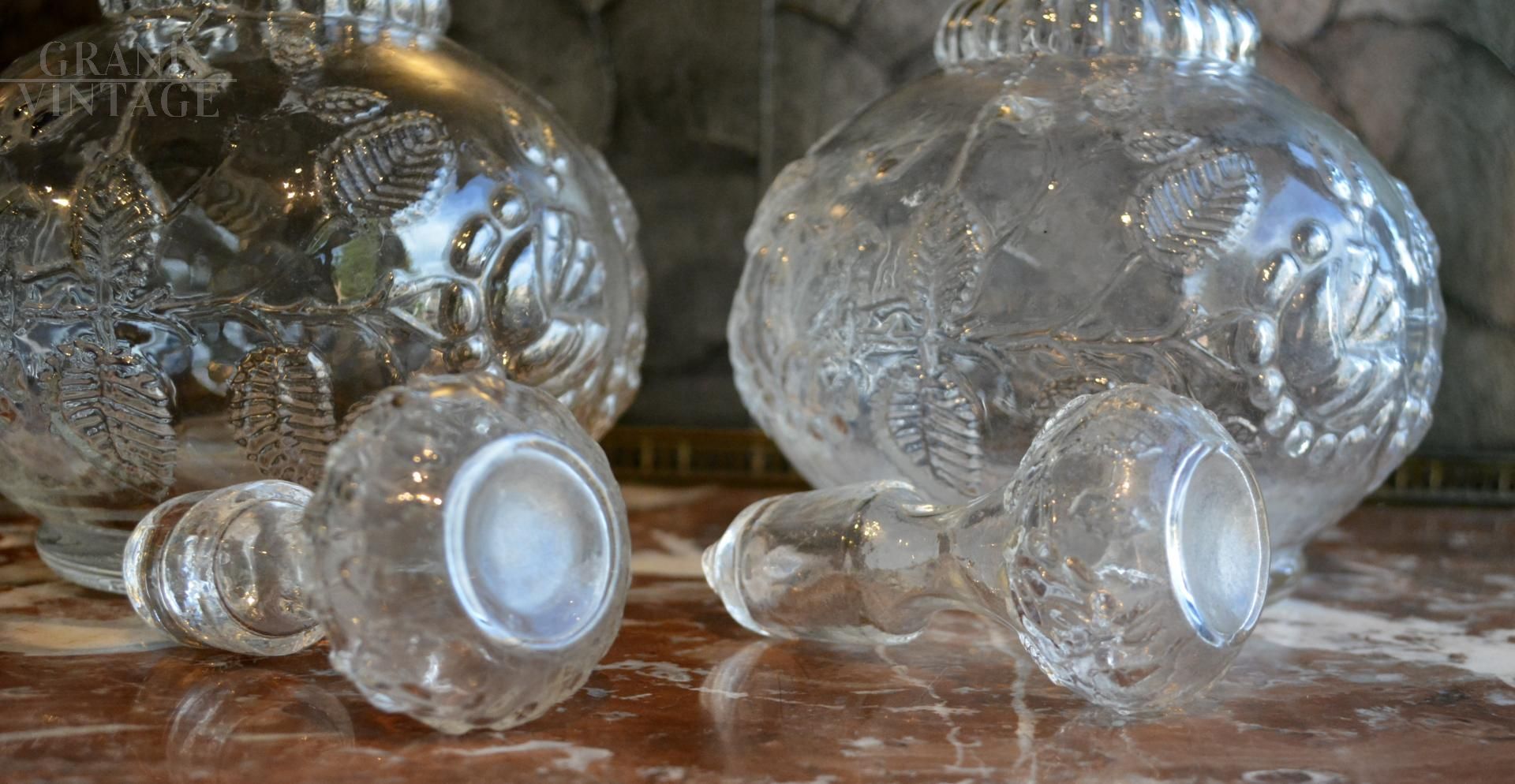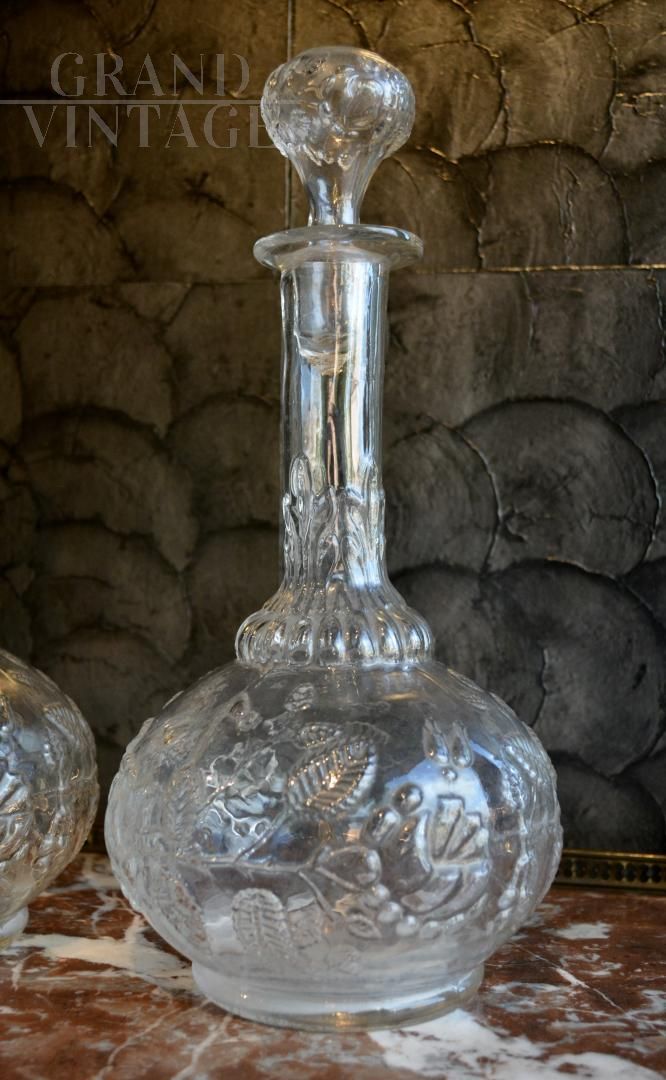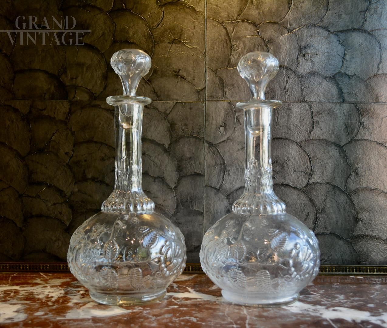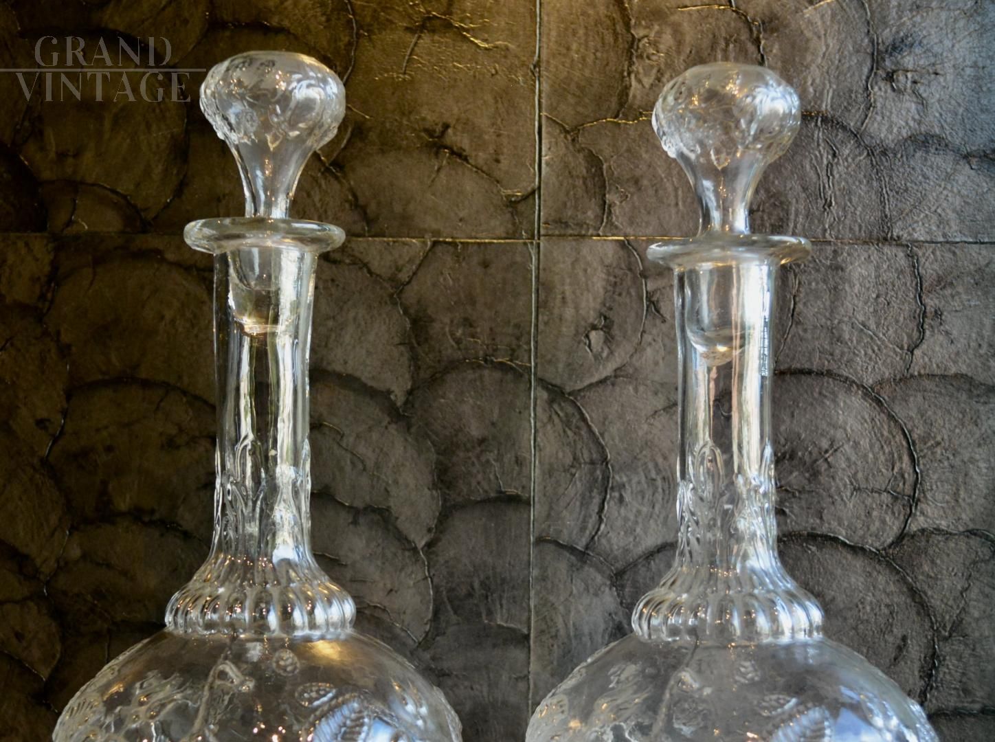 Coppia di bottiglie da vino del XX secolo in vetro molato e decorato, complete dei tappi originali, in perfette condizioni. Le misure fornite sono con il tappo inserito.