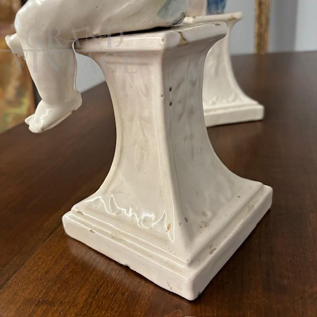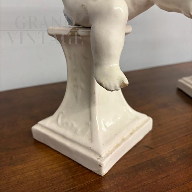Coppia di candelabri con putti in ceramica di Angelo Minghetti, Bologna fine '800