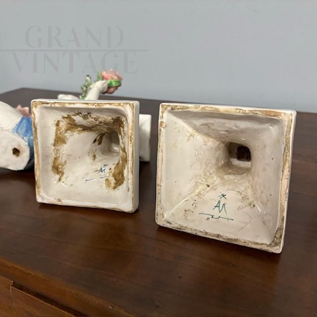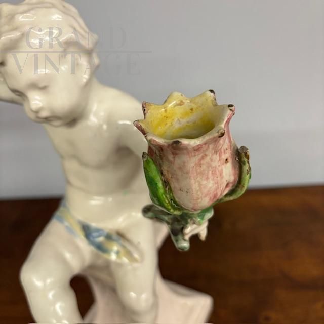 Coppia di candelabri antichi di fine '800 in ceramica di Angelo Minghetti Bologna con putti e fiori su piedistallo, firmati. Questi candelabri sono una rarità, con piccoli naturali difetti e mancanze. Altezza 37 cm.