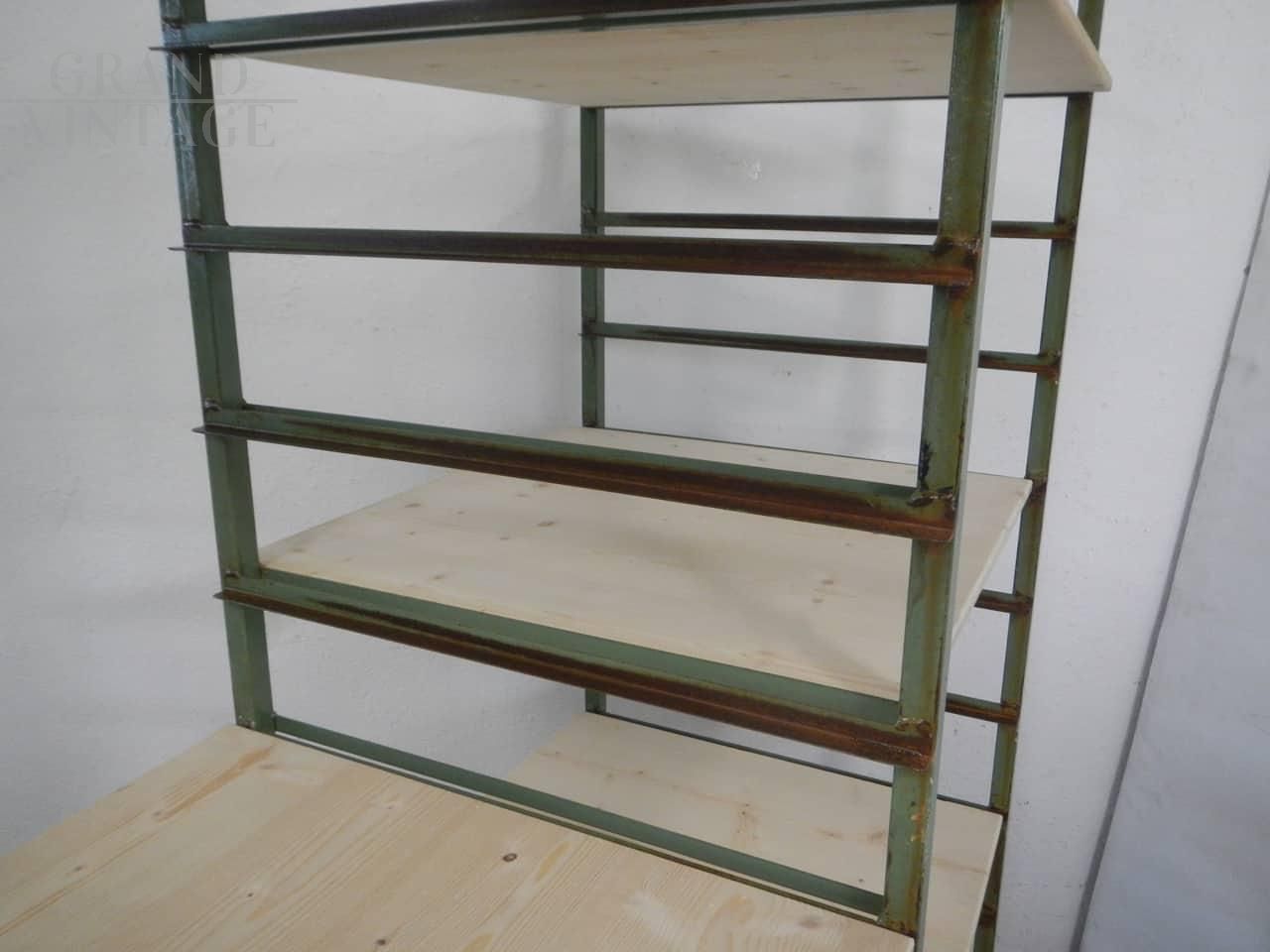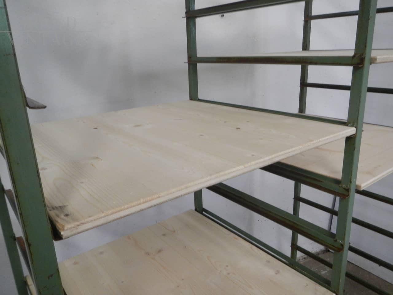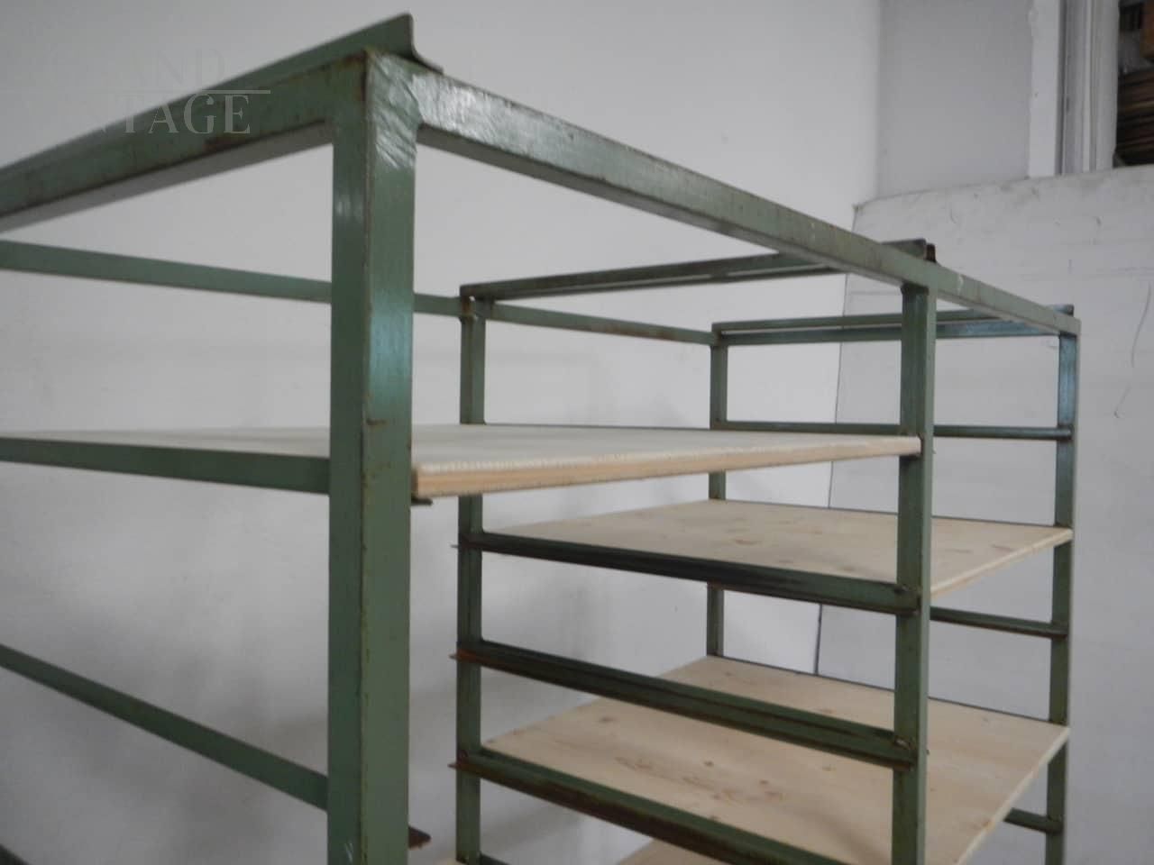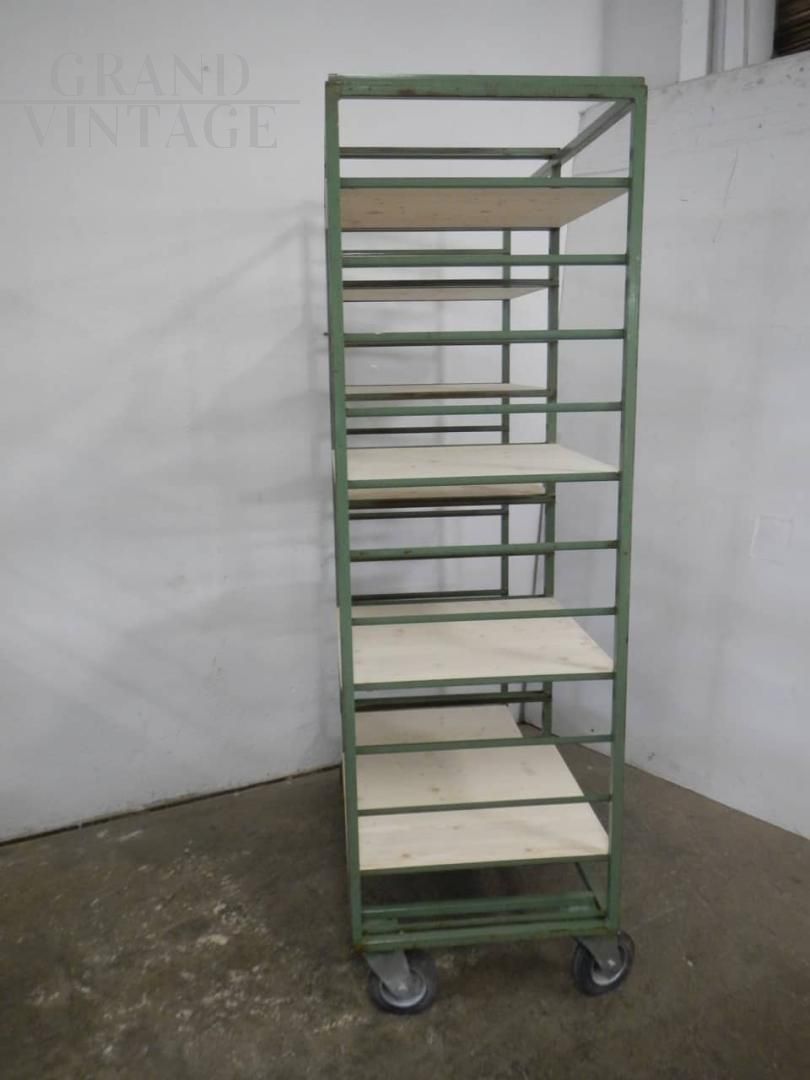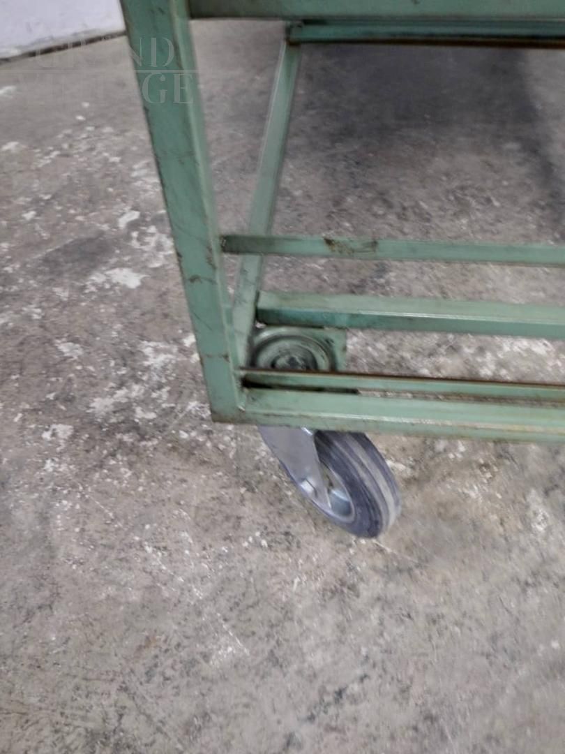 Coppia di carrelli industriali usati nei laboratori di ceramica in metallo verde, con ripiani in abete multistrato naturale. I pannelli sono 8 e spostabili nella posizione scelta. I ripiani misurano 50 x 50 cm. I carrelli sono stati trattati con vernice da ferro che li rende lisci al tatto pur preservandone l'aspetto originale. Ruote funzionanti e originali, presenta naturali segni d’uso