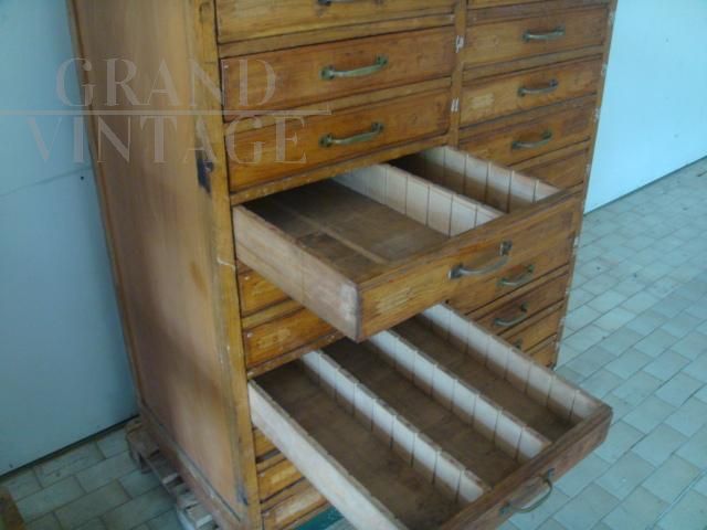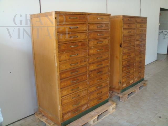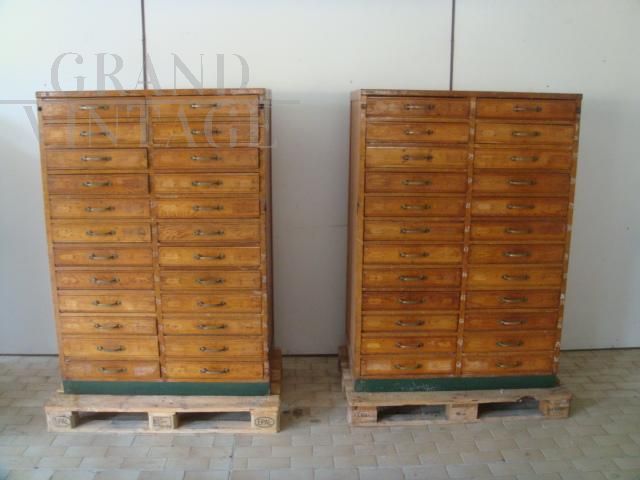 Bellissime cassettiere da ufficio industriali vintage in legno di faggio, anni '50, ideali per arredare una casa in stile industriale, o come schedari o classificatori per ufficio. Il prezzo si riferisce alla coppia.
