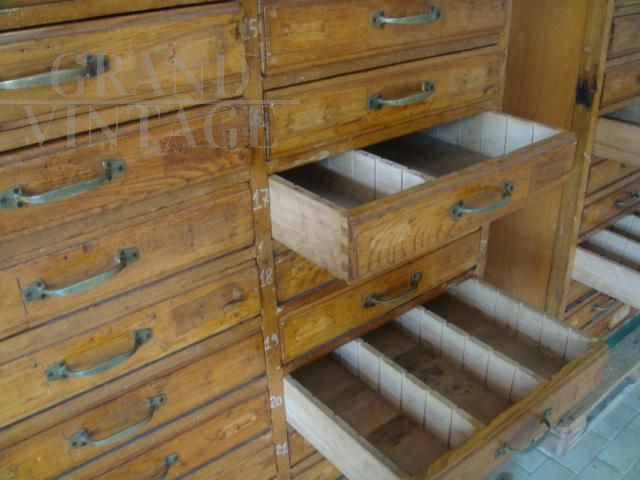 Ciascuna cassettiera ha 24 cassetti con incastro a coda di rondine, con misure 50 x 60 cm e con altezza 8 cm.