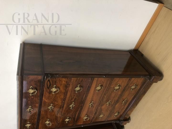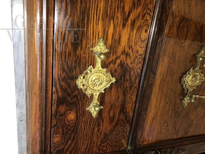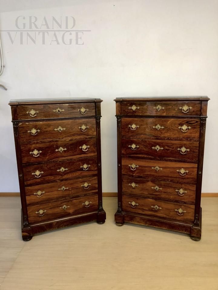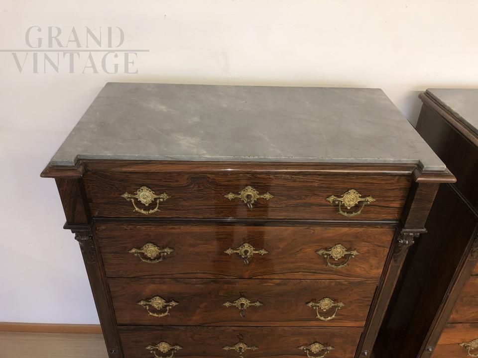 Elegante coppia di cassettiere settimanali antiche lastronate in legno di palissandro, realizzate alla fine dell'800, presentano una buona qualità di materiale e una ricca ferramenta, sul coperchio è presente il piano in marmo. In buone condizioni generali, necessita di qualche piccolo lavoro di restauro e di rifacimento di alcune maniglie mancanti.
