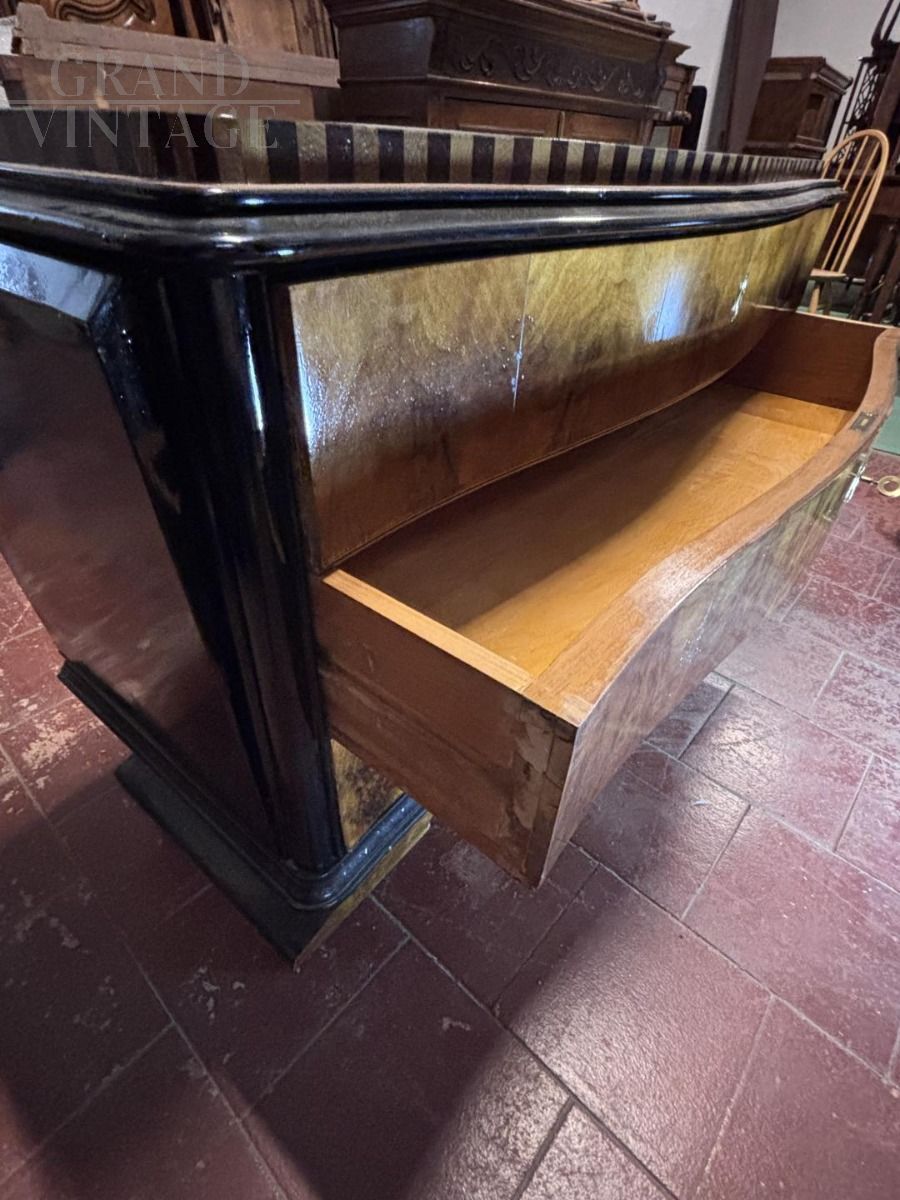 Bellissima coppia di comò cassettoni del periodo tardo Art Déco impiallacciati in noce biondo, con cassetti impiallacciati in radica di noce. Fianchi, piano, piedi presentano bei decori ebanizzati. Ottimo stato di conservazione.