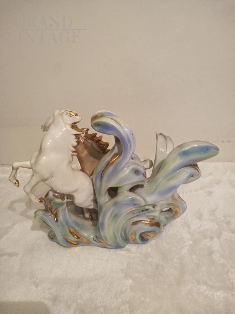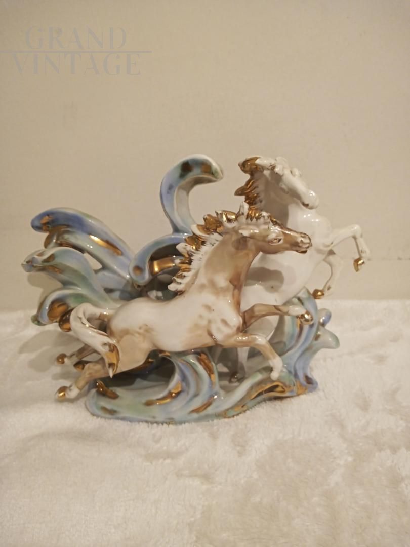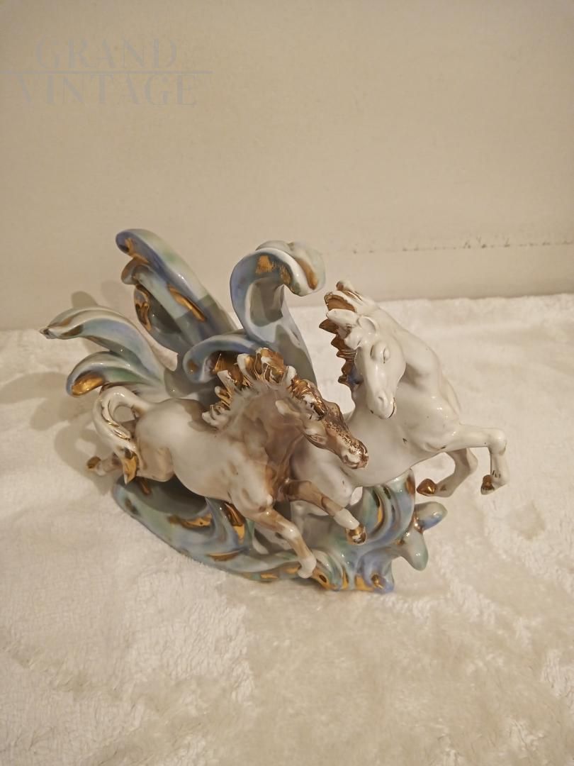 Scultura in ceramica Edera anni '30 raffigurante una coppia di cavalli rampanti bianchi con dettagli dorati. La base effetto acqua è invece nelle tonalità dl verde e dell'azzurro. In ottime condizioni, molto bello,