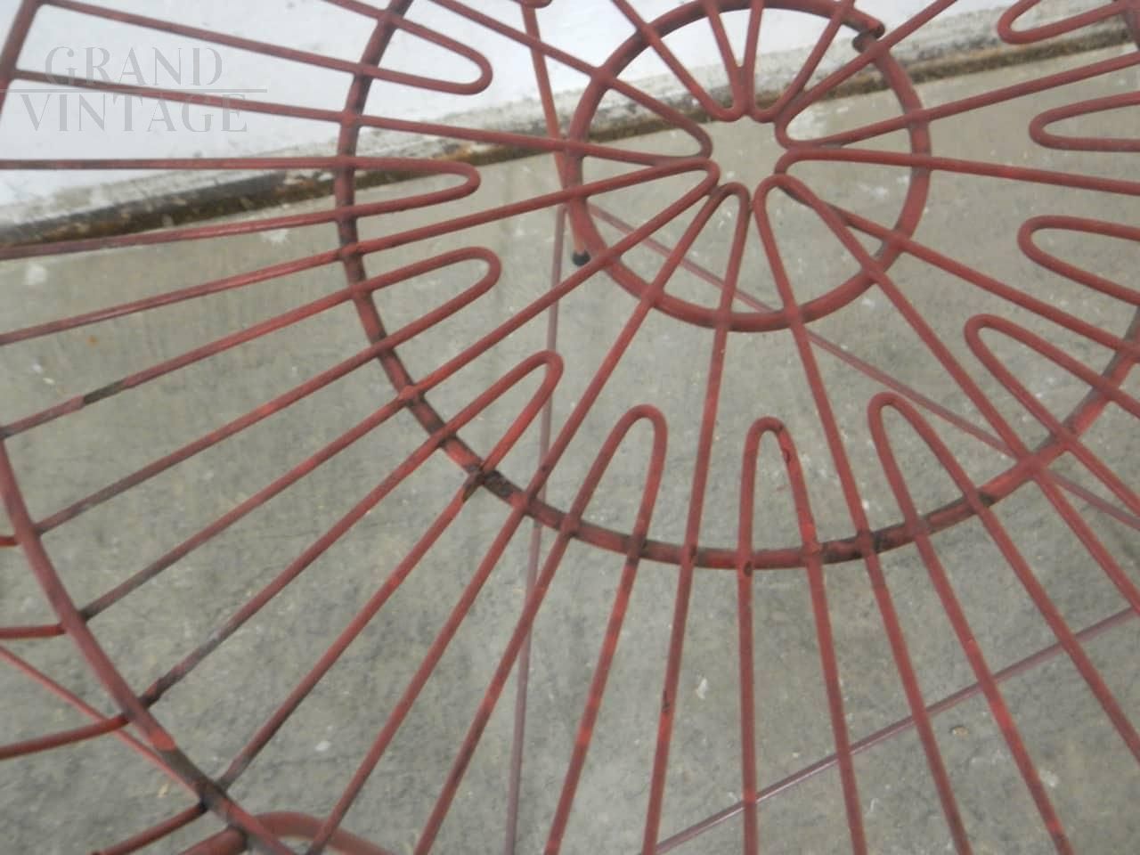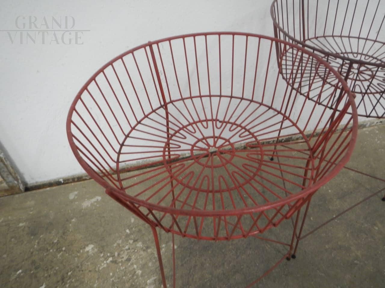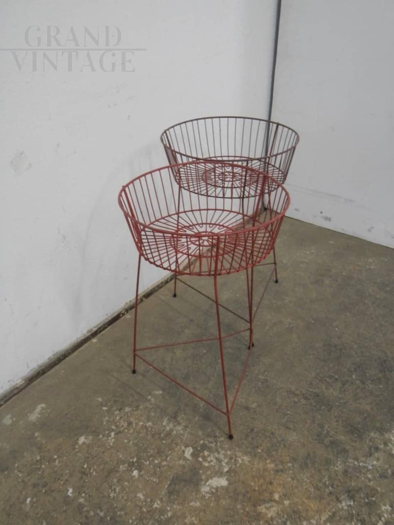 Coppia di ceste espositori da esposizione da negozio vintage in metallo plastificato rosso, adatte anche come portavasi. Le ceste misurano 40 cm di diametro e 12 cm di altezza. Una delle 2 ceste presenta segni d’uso, l’altra è in ottime condizioni. Piedini originali.