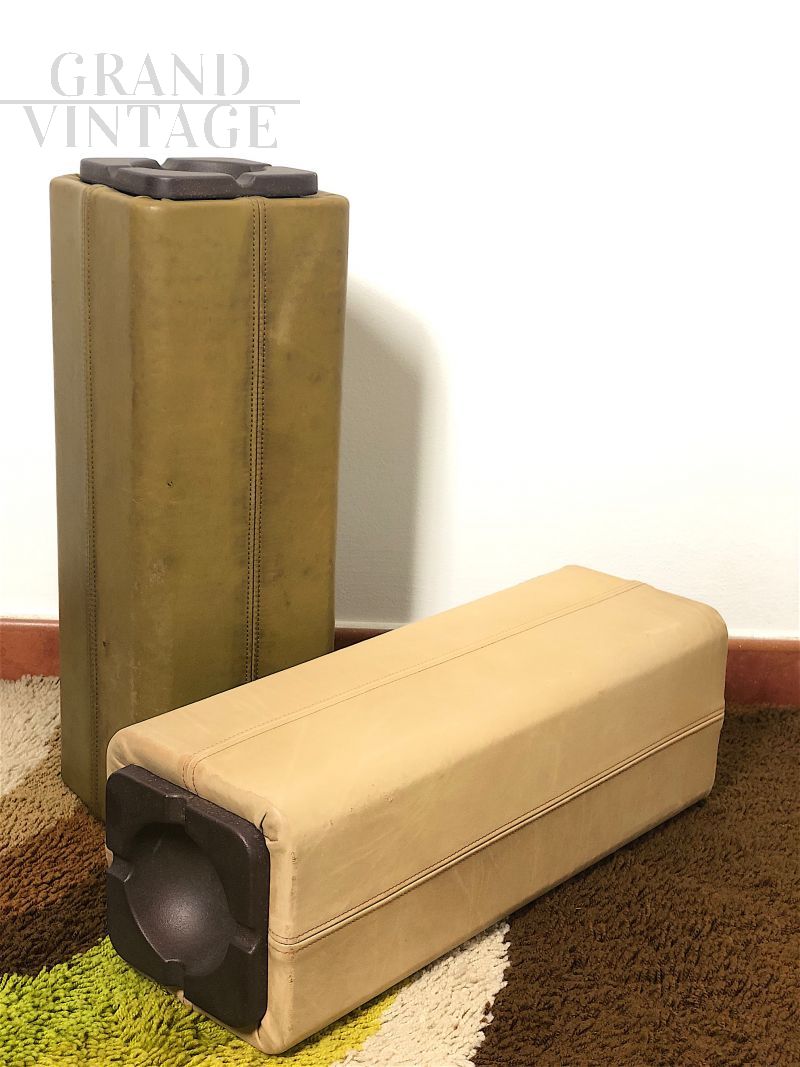 Elegante coppia di posacenere a colonna anni '70 dal design unico, caratterizzati da un rivestimento in pelle e posacenere in ghisa. Oggetti dal forte carattere decorativo, la loro forma e l'utilizzo della ghisa rimandano a uno stile brutalista. Entrambi si presentano in buone condizioni, con normali segni del tempo che ne testimoniano l'autenticità: negli anni '70 si sperimentava con materiali e design geometrici per creare oggetti funzionali ma anche decorativi. In ottime condizioni.