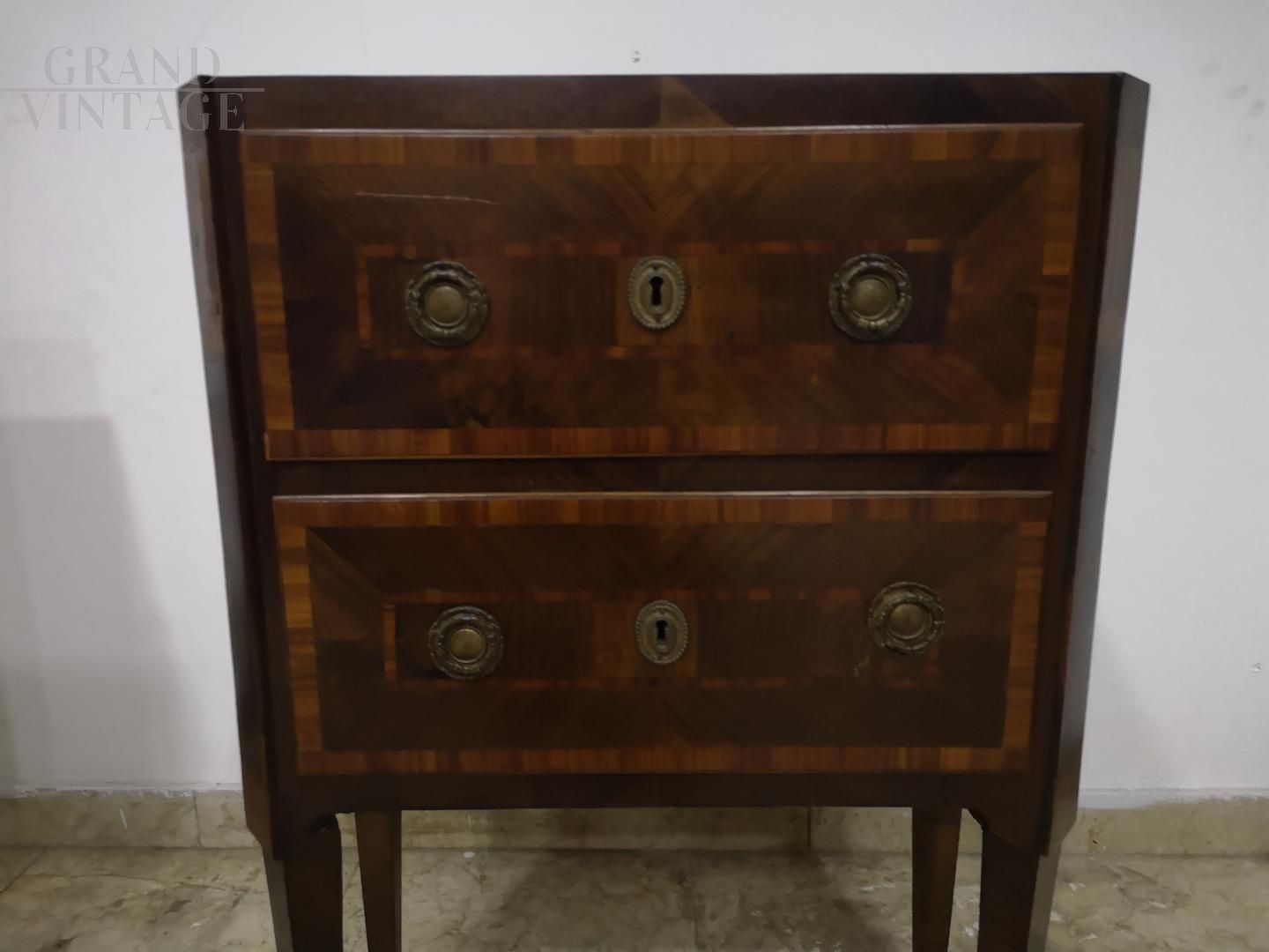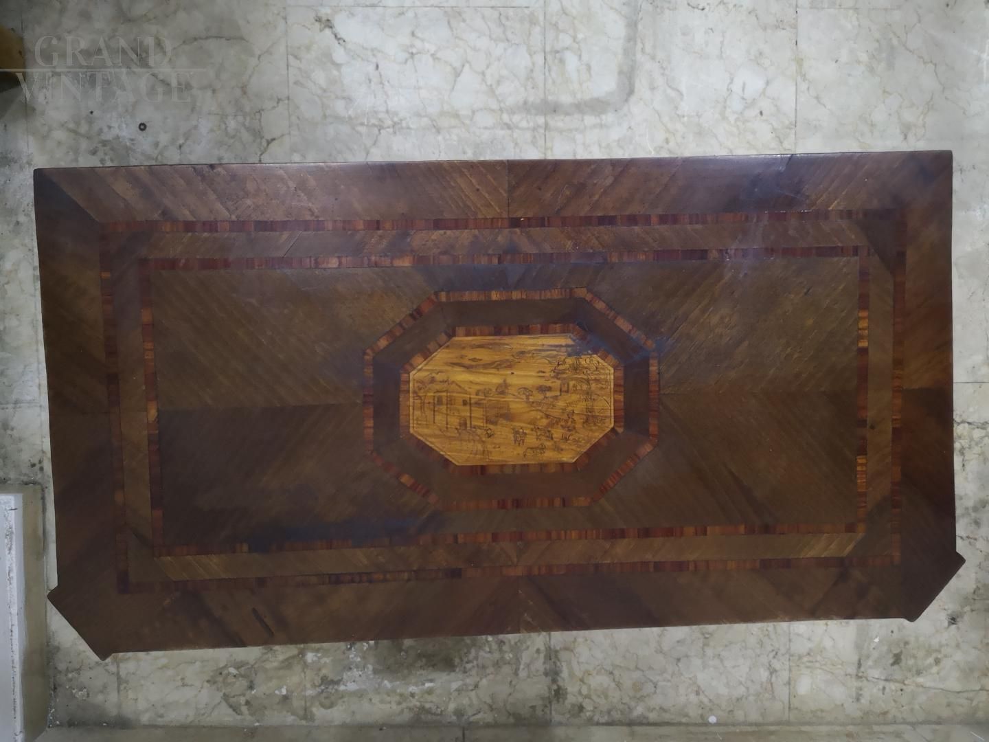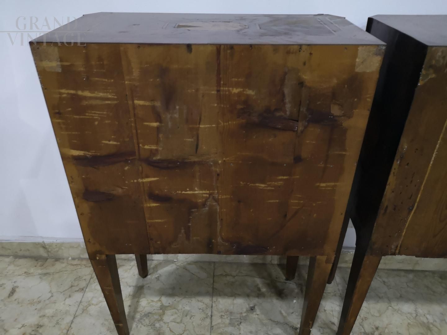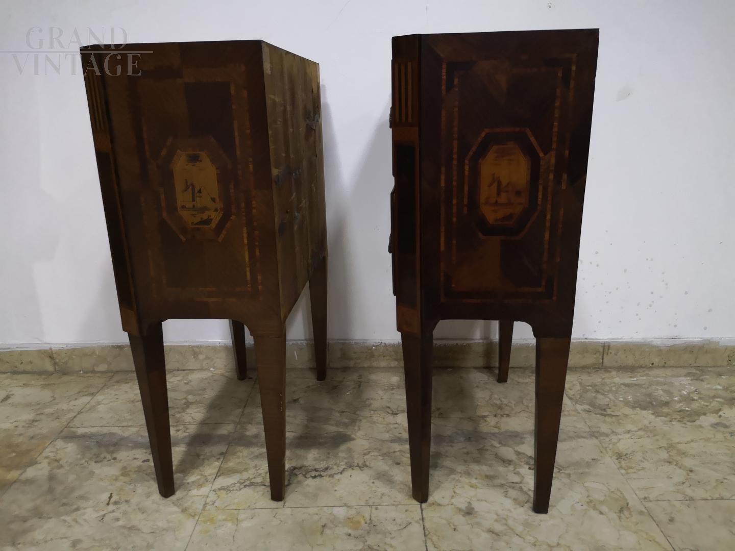 Coppia di comodini antichi Luigi XVI, con intarsio di paesaggio sul piano