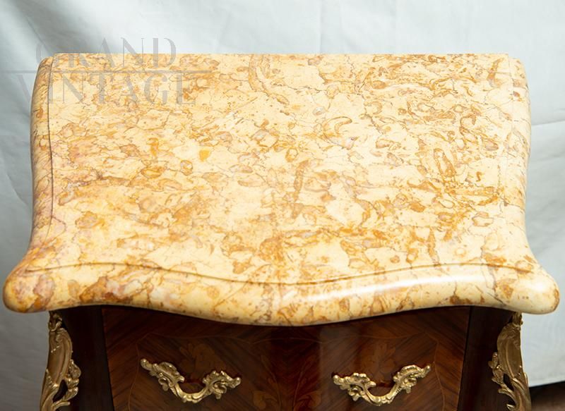 Coppia di comodini Napoleone III Francesi in legno esotico pregiato con piano in marmo giallo Siena. Il prospetto frontale è caratterizzato da due cassetti adornati da maniglie in bronzo dorato finemente cesellato. Sia sul fronte che sui lati sono adornati con un intarsio a motivo floreale ,mentre i piedi a cabriolet terminano con dei calzini in bronzo. I comodini sono in ottime condizioni, restaurati da maestri artigiani con metodo tradizionale gommalacca e alcool fatto a mano.