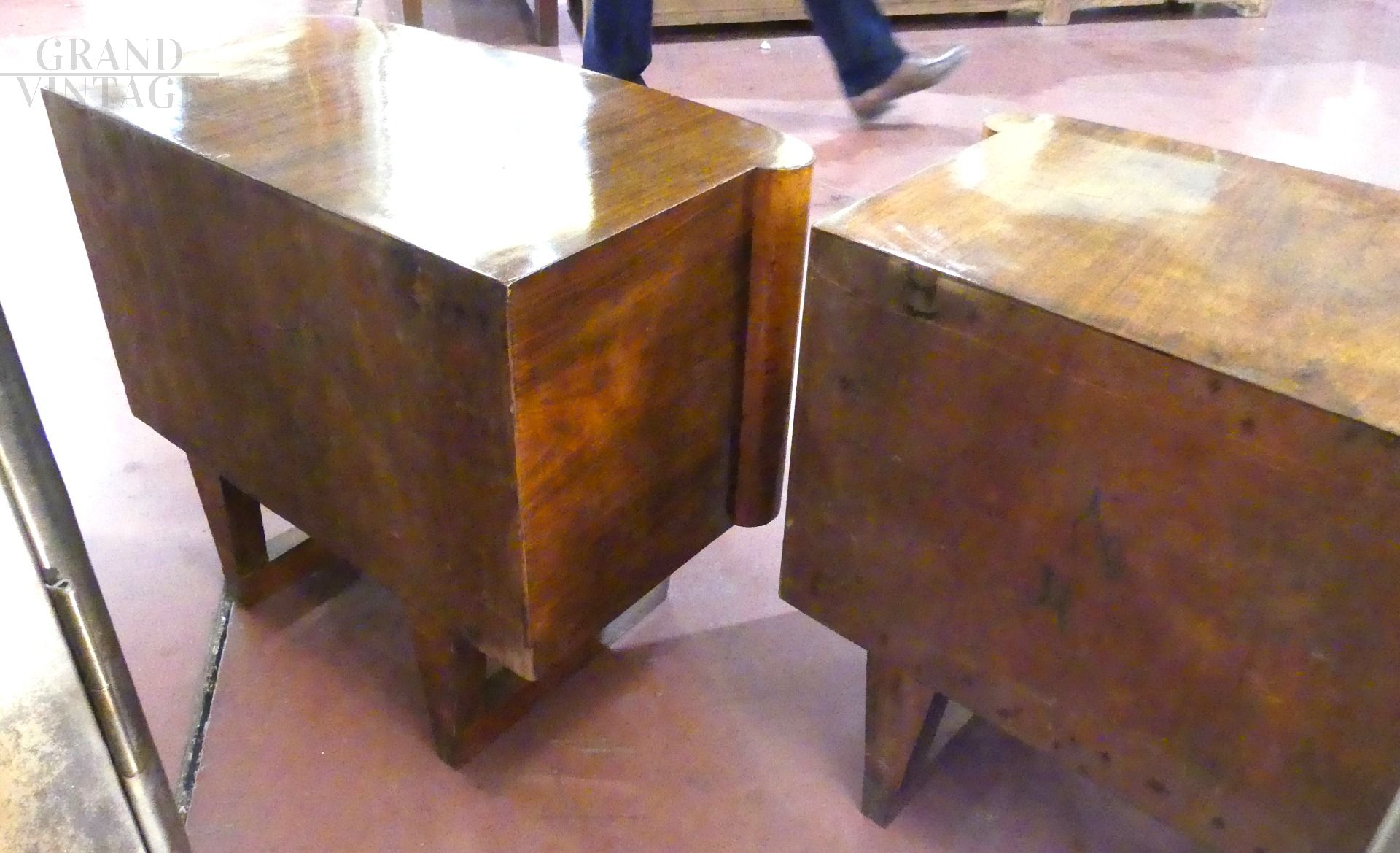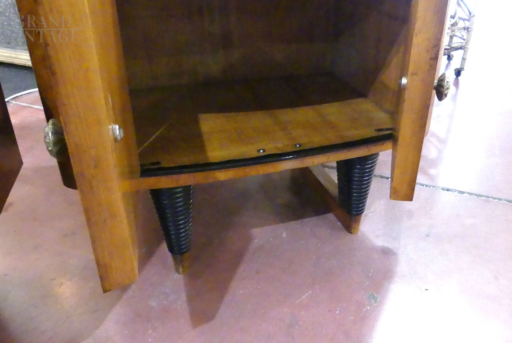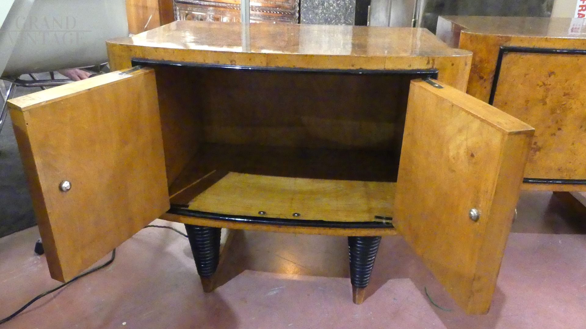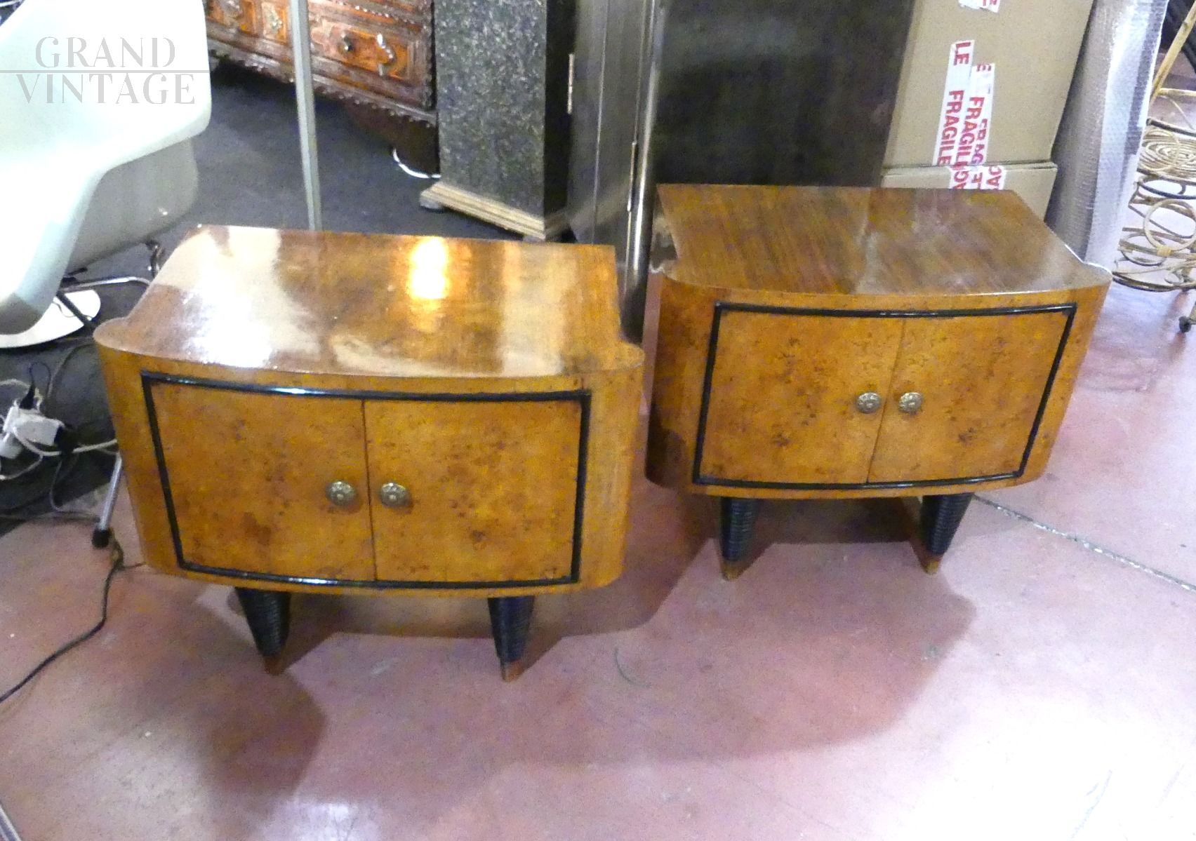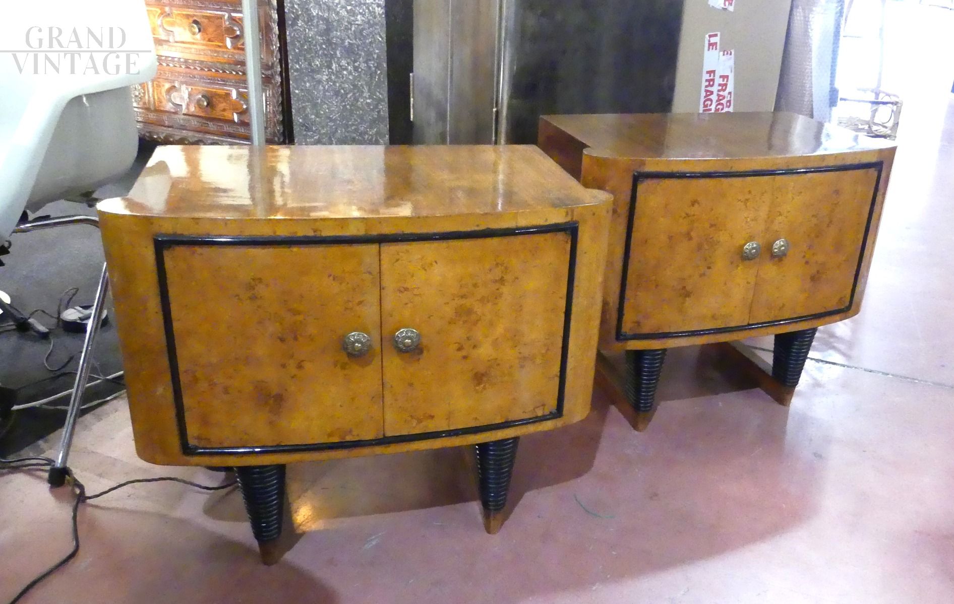 Bellissima coppia di comodini art déco anni '40 in radica di rovere e pioppo con profili ebanizzati, gambe molto particolari con decoro in torciglione ebanizzato e con un unico pezzo in legno che unisce le gambe anteriori alle posteriori.